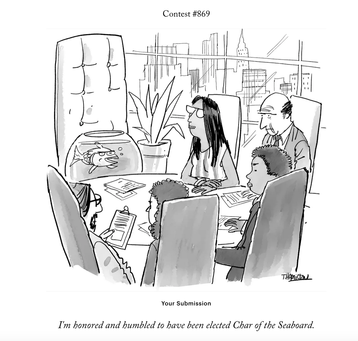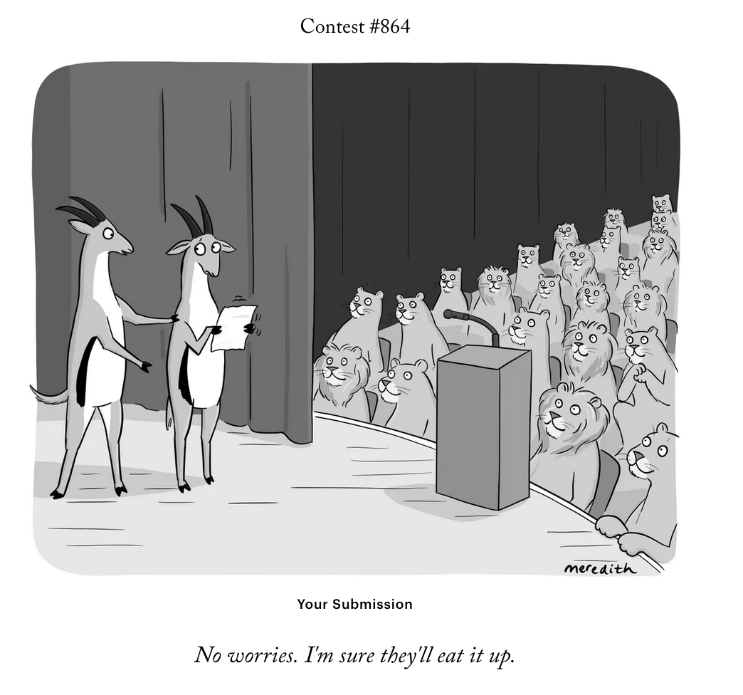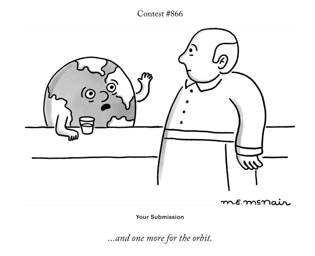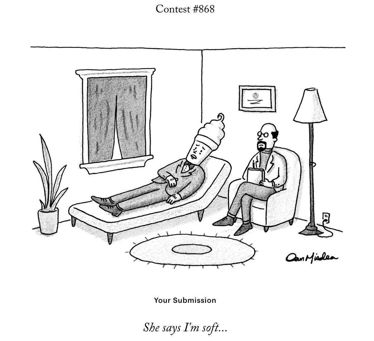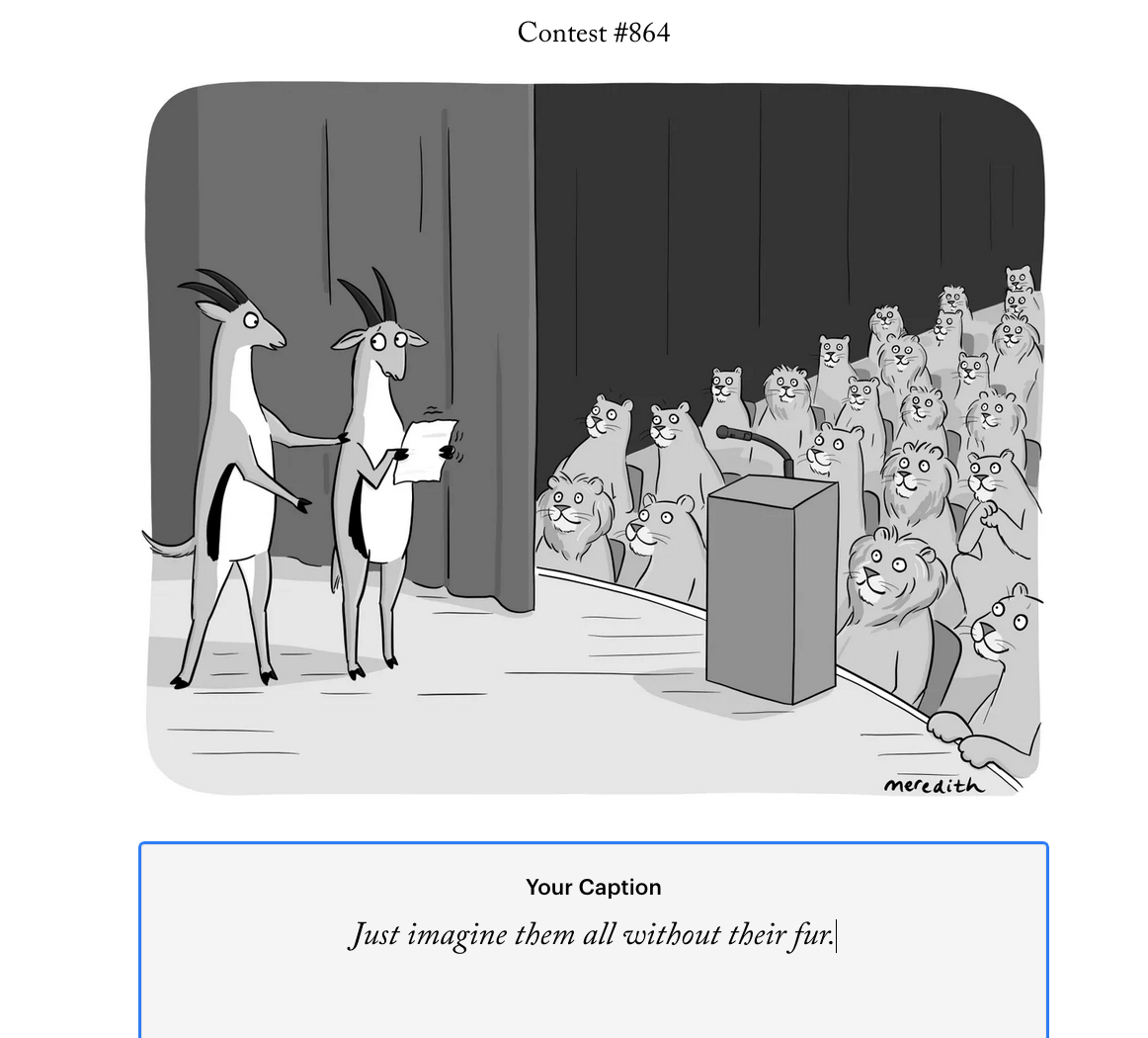 Look up the first and second installments of my unselected New Yorker Cartoon Caption Contest submissions here and here.