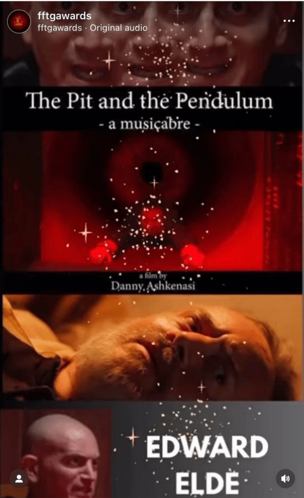 Winner: Edward Elde (sic) for “The Pit and the Pendulum – a musicabre.” Playing the Rescuer, Edward Elde’s (sic) performance in this musical adaptation of Poe’s classic story stands out for its intensity and depth, contributing significantly to the film’s chilling atmosphere.