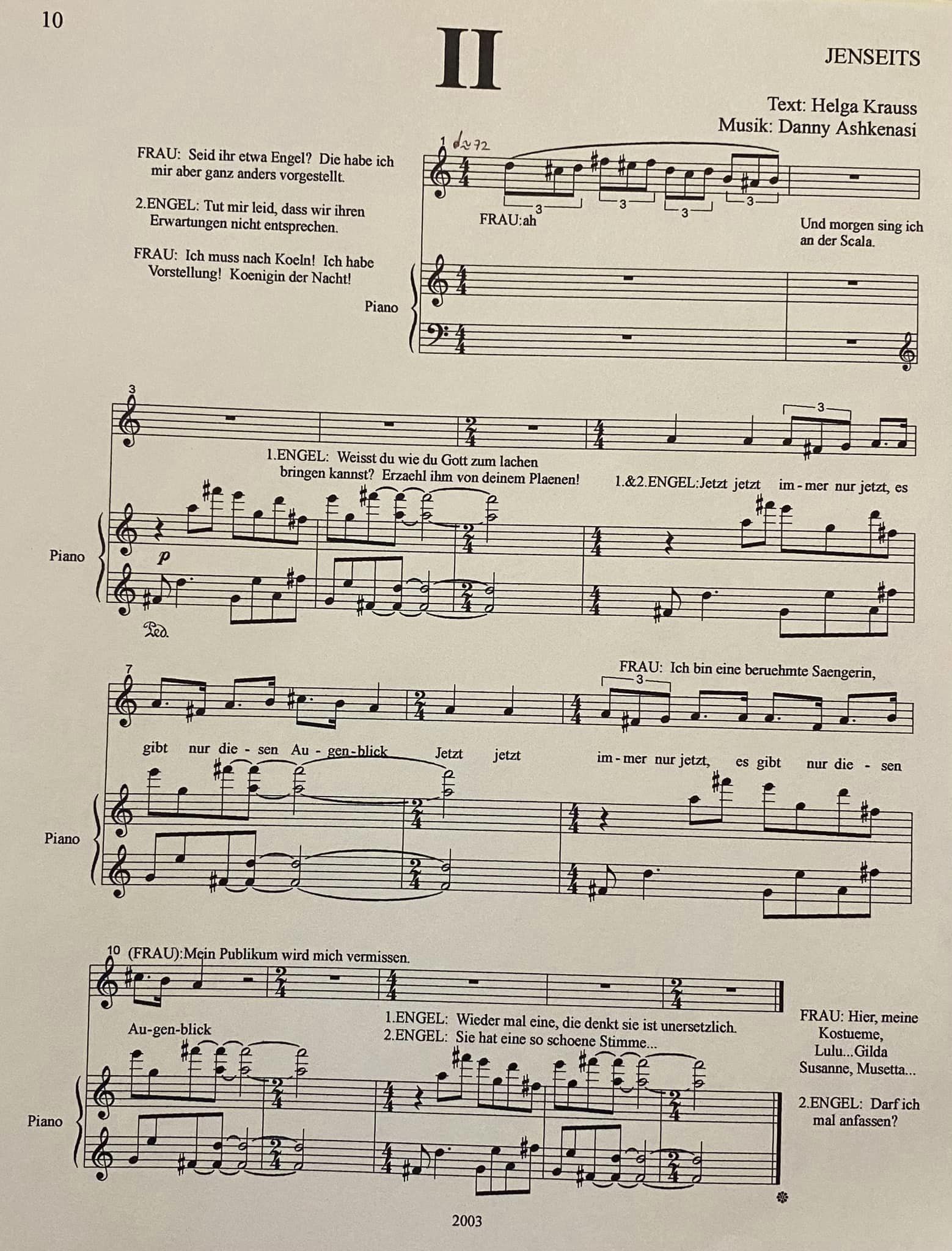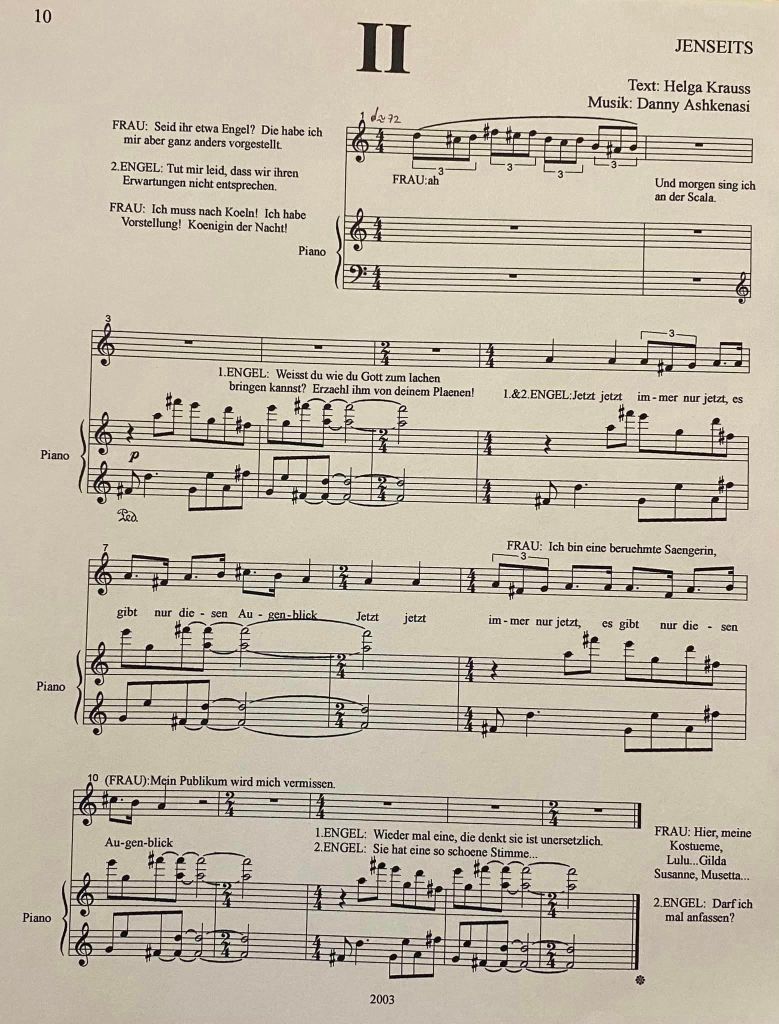 Twenty years ago family friend and screenwriter Helga Krauss and I created a one-act opera for my mother, Catherine Gayer (AKA Catherine Ashkenasi, her maiden name being her stage name). Helga wrote the libretto and I composed the music. It is the story of an opera singer who after a serious car crash is met by two angels who take her on a tour of her life and psyche to help determine whether she returns to life or passes on. The opera is called “Jenseits”. The English title – I was responsible for the English translation – is “Beyond”.