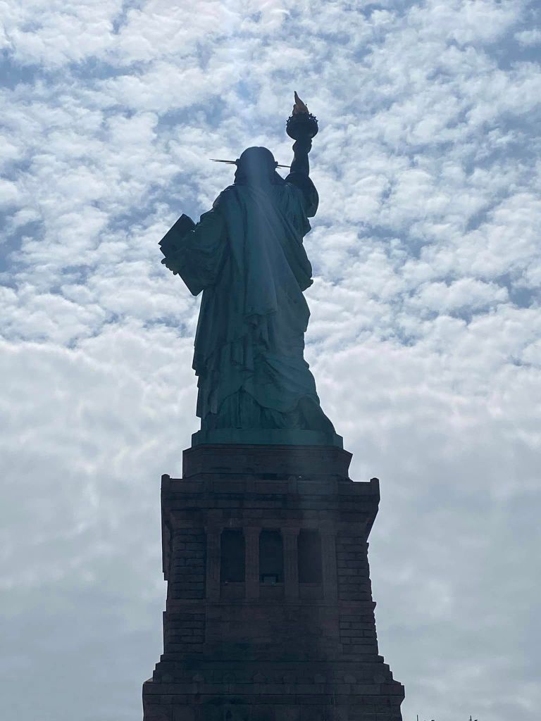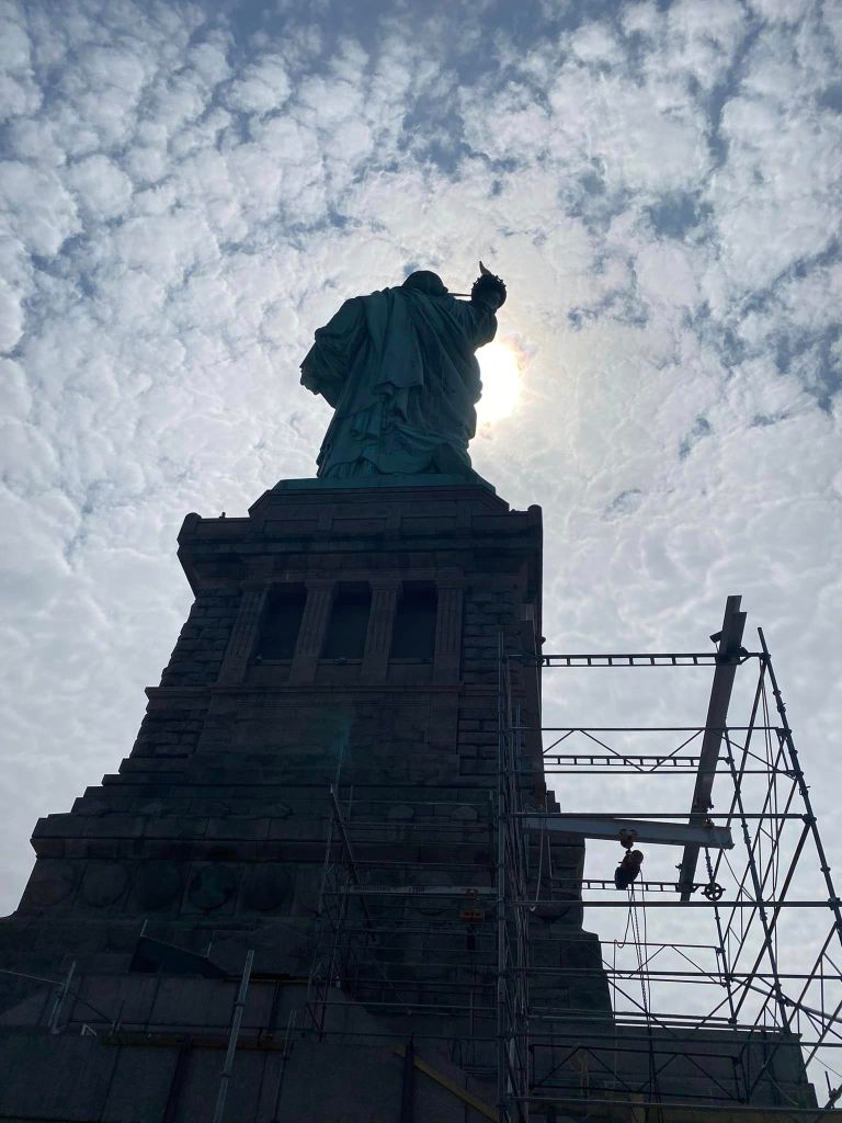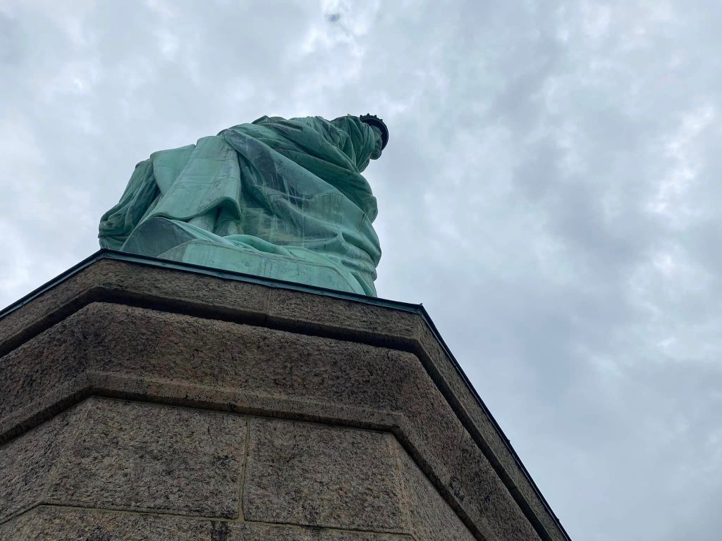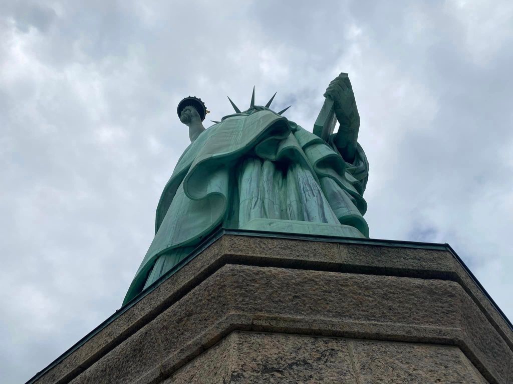 The morning started grey and rainy but turned sunny and blue around the time we reached the viewing gallery in Lady Liberty’s crown, allowing for some contrasting views in approach and retreat.