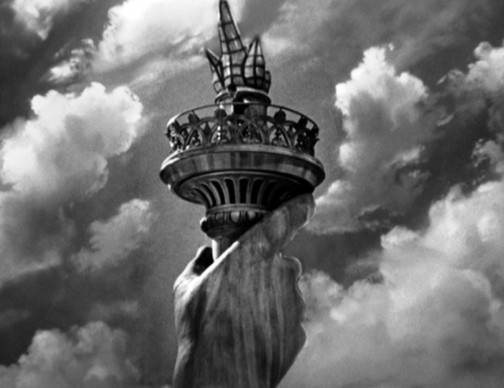 Tourists used to be able to climb up the statue’s arm to an outdoor viewing gallery in the torch. This is no longer allowed. But in 1942 Hitchcock staged the climax of the thriller “Saboteur” there. It’s possible that Robert Cummings and unfortunate Norman Lloyd’s antics helped contribute to the closing of the torch to the public*.
