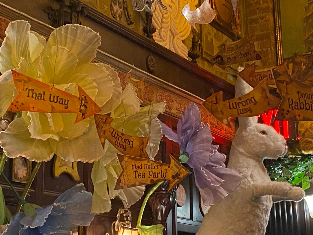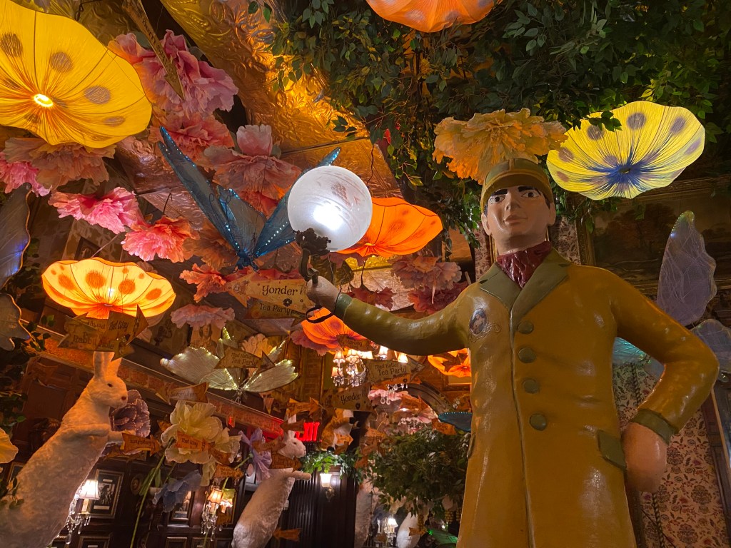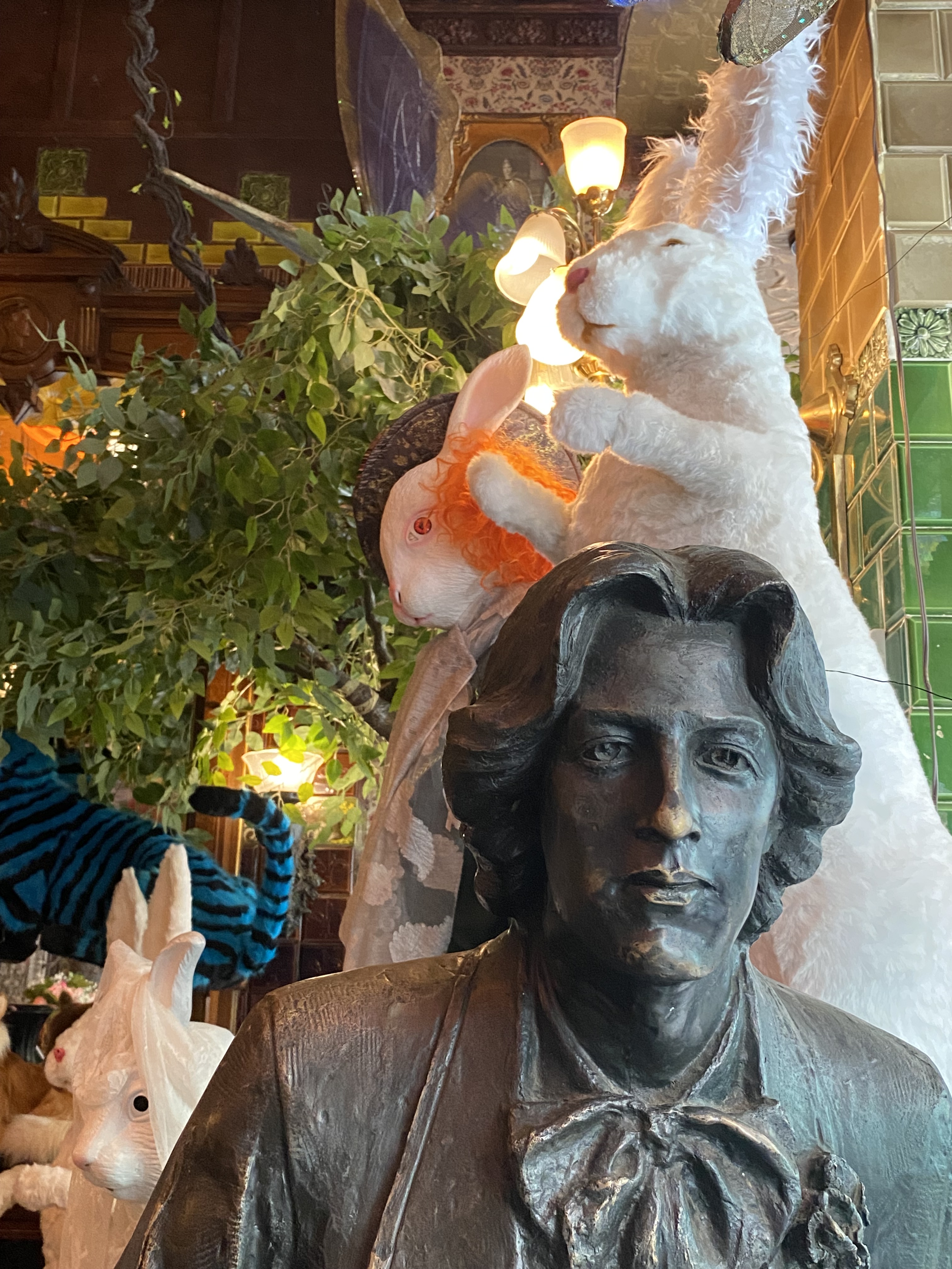 As you wait to be seated, a statue of Oscar Wilde hands you plastic baggies for your wet umbrellas, while an array of Carrollesque characters enjoy a tea party.