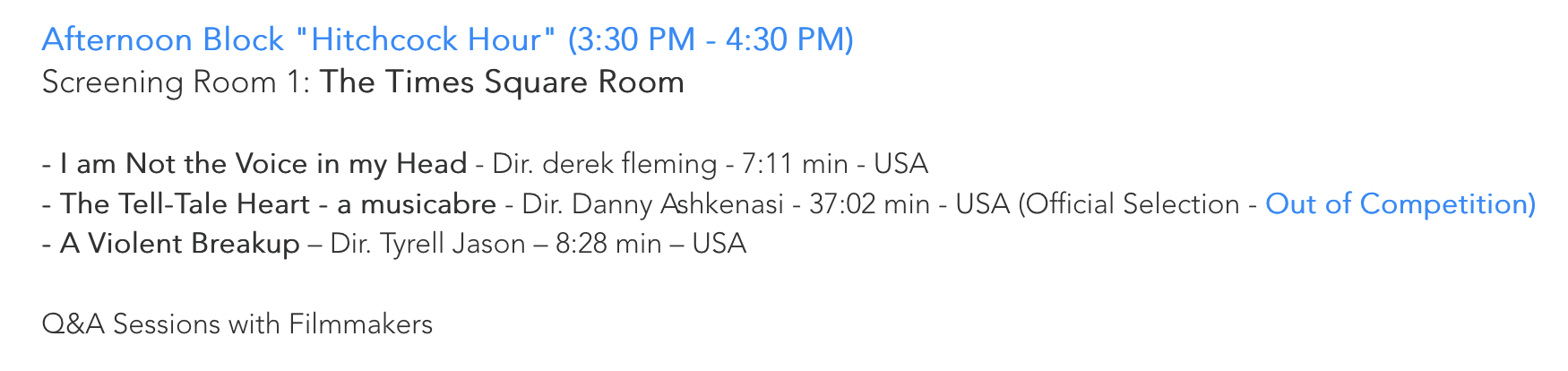 And so again, here in New York City, February 25th at 3:30pm, the North Film Festival has scheduled “The Tell-Tale Heart – a musicabre” for an encore screening. I’ll be there for a Q&A.