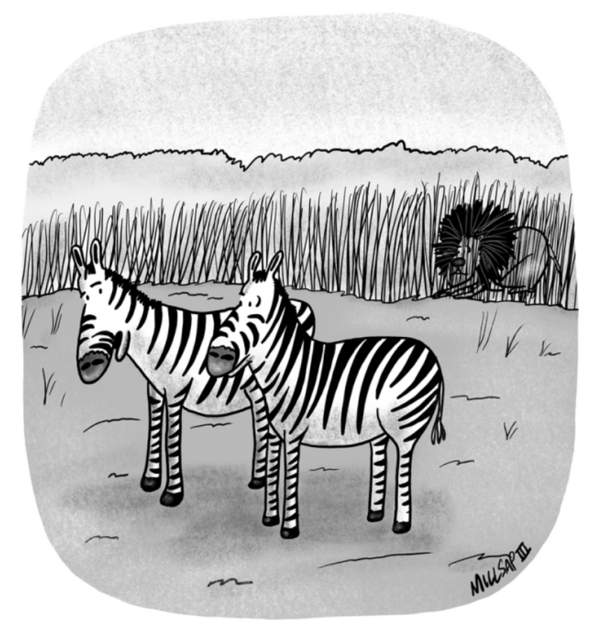 (What was I thinking? Something about the stripes the lion is hiding behind not fooling the striped zebras. But if it needs to be explained… yeah, I’ve done better.)