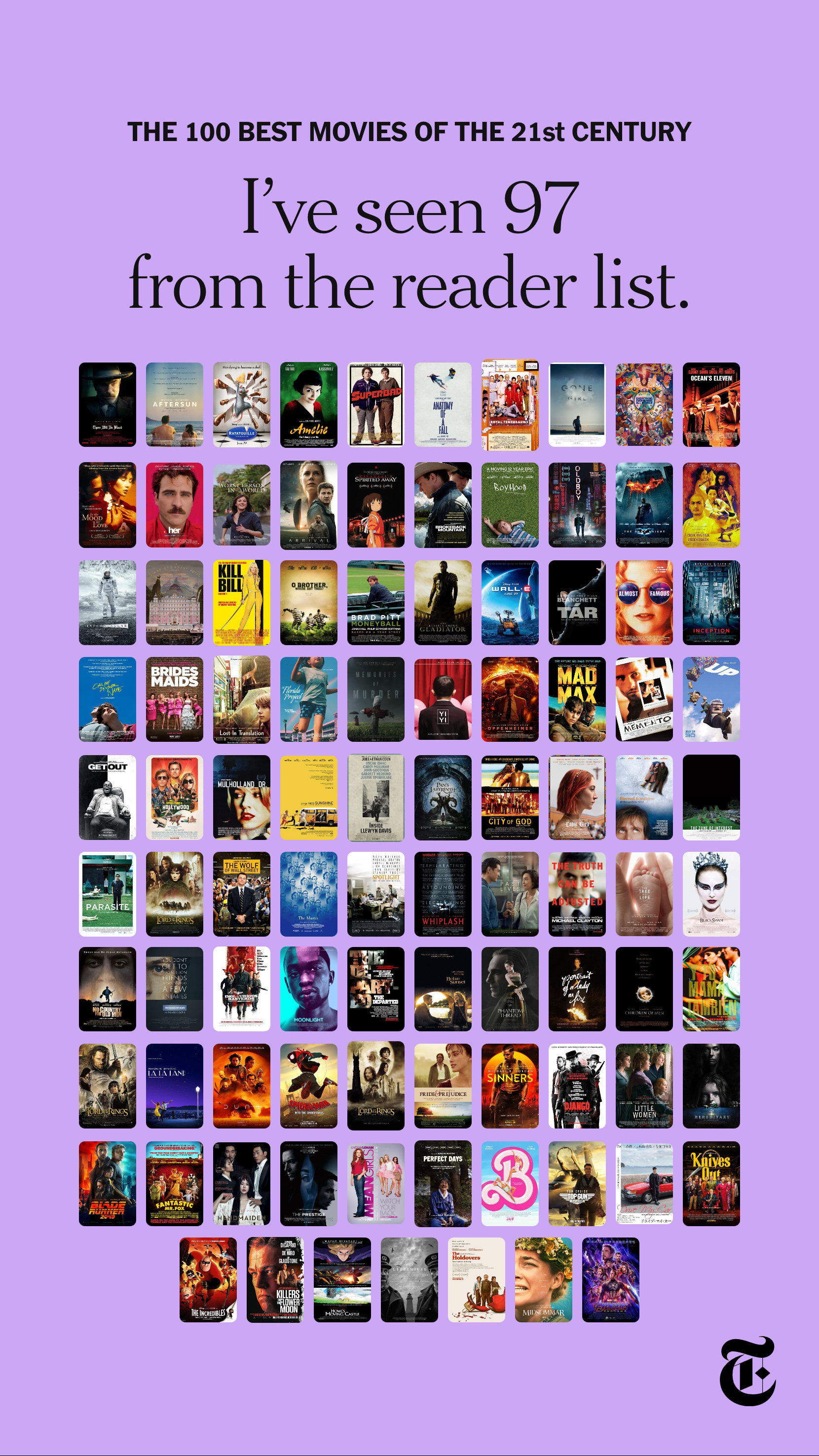 UPDATE: The NYTimes later compiled a readers Top 100 list from 200 000 submitted ballots. I’ve see 97 of those films.
