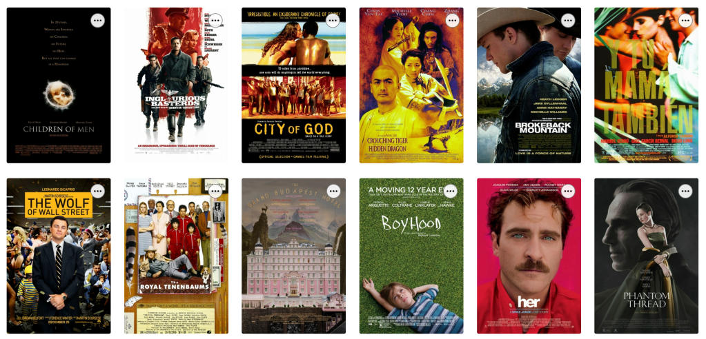 The New York Times compiled a list of the 100 greatest movies of the 21st century. More than 500 filmmakers, stars and influential film fans were asked to vote for the 10 best movies (however they chose to define that) released since Jan. 1, 2000. Perusing some of the individual ballots reveals a wide variety of choices and tastes and often precious little overlap. Still, from all that data a ranked list of 100 was compiled.