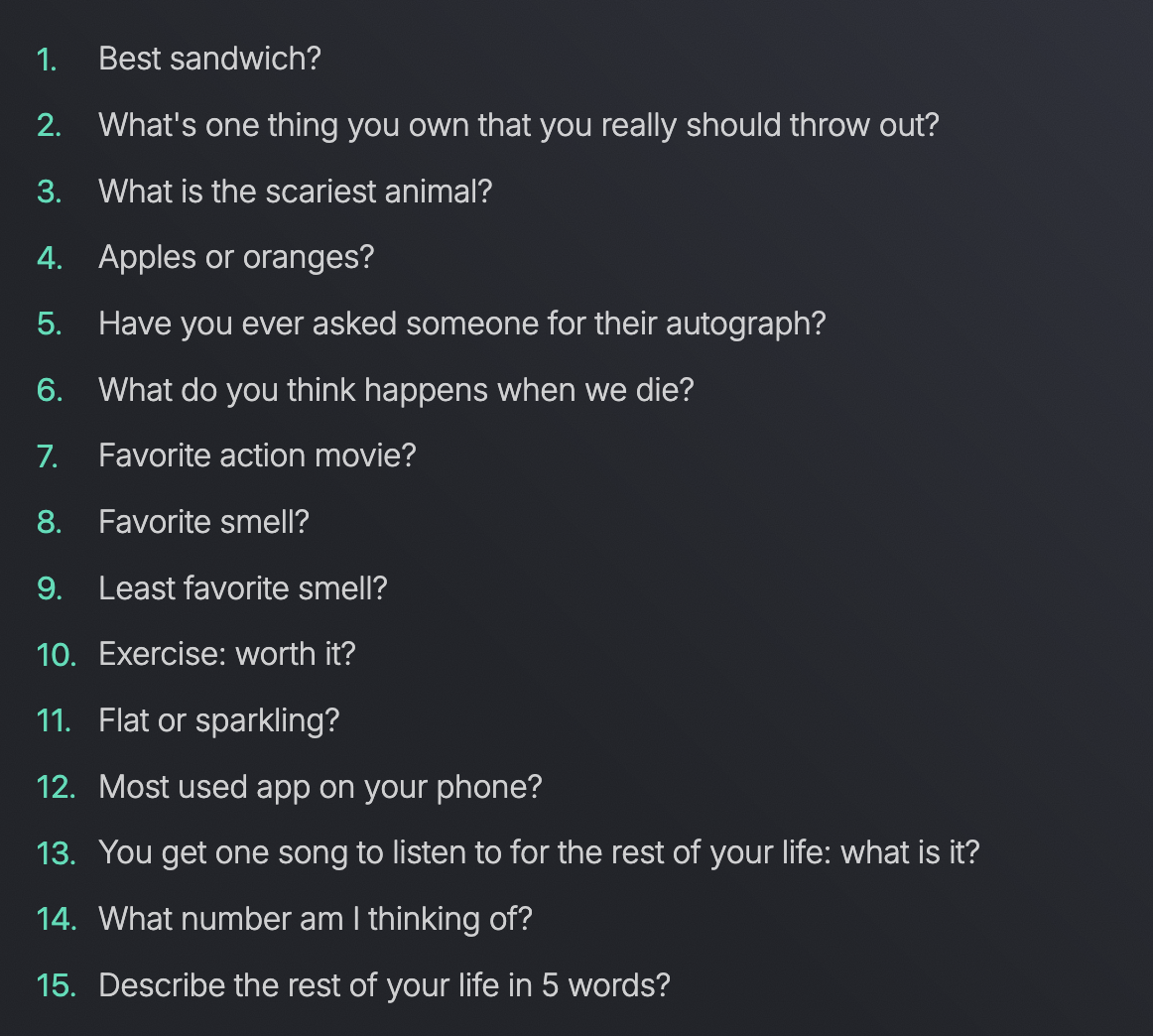 Above are the 15 questions. Well, those are the original 15 questions, but over time four of these (numbers 2, 10, 11 and 12) got replaced with new and improved questions.