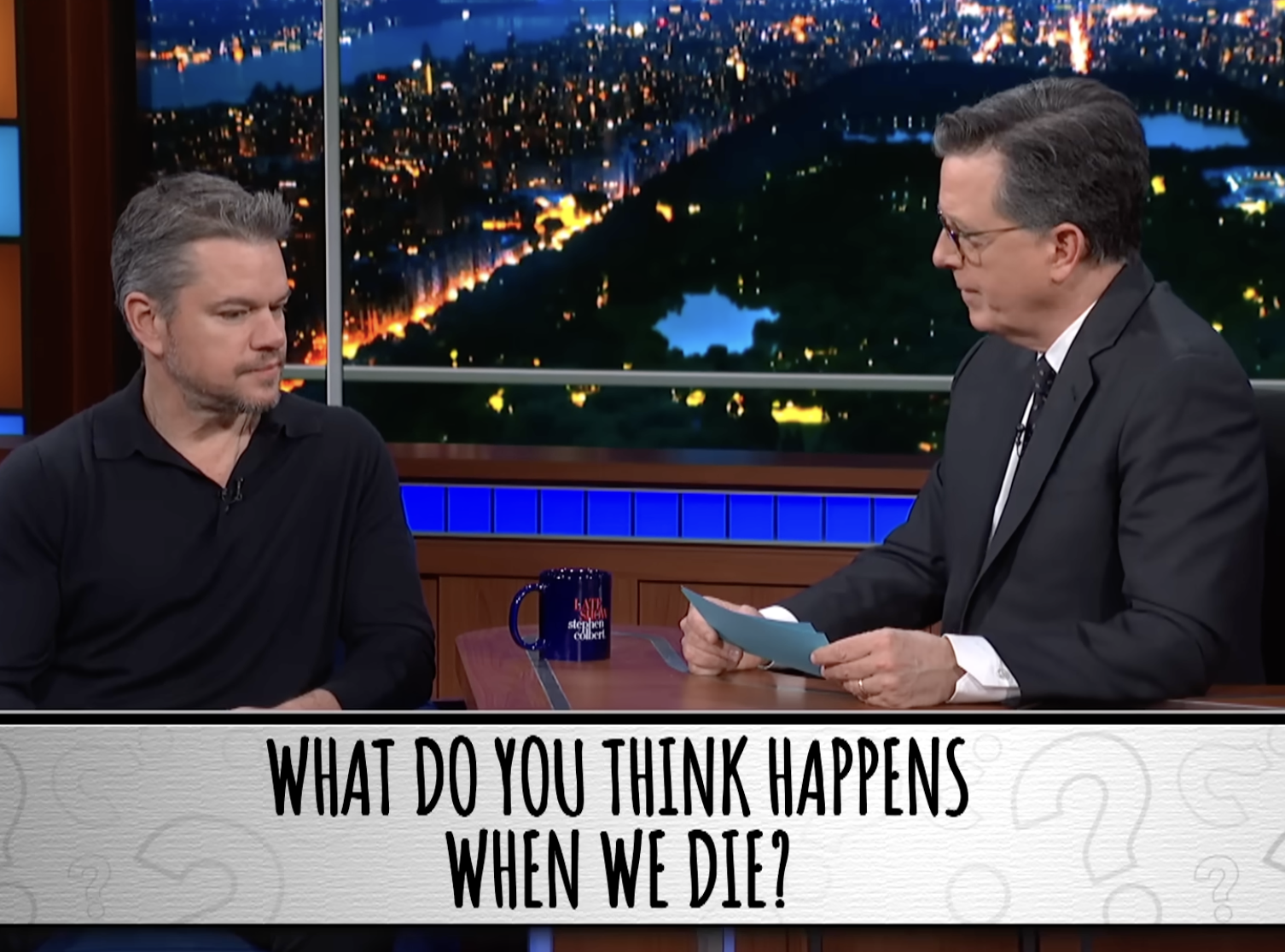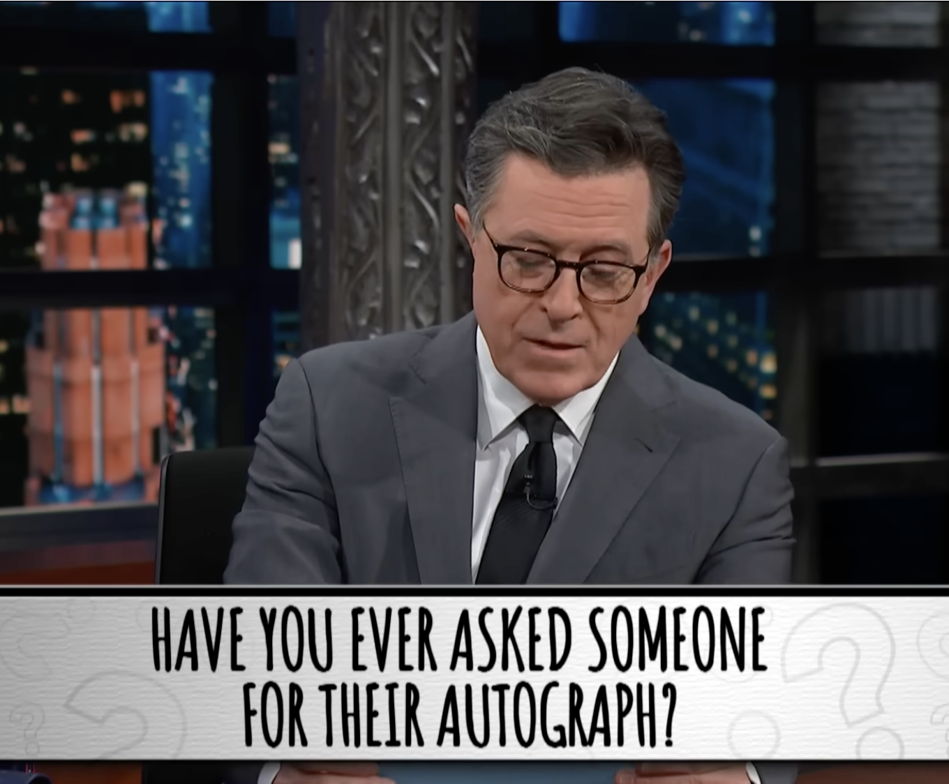 I’m guessing this question got exchanged rather quickly with an alternate, because I have no memory of it being asked, let alone a memory of this question leading to a memorable exchange between Colbert and his guest. I had to go down a YouTube rabbit hole to find an example of Colbert asking it (and the response was quick and obvious and they swiftly moved on).