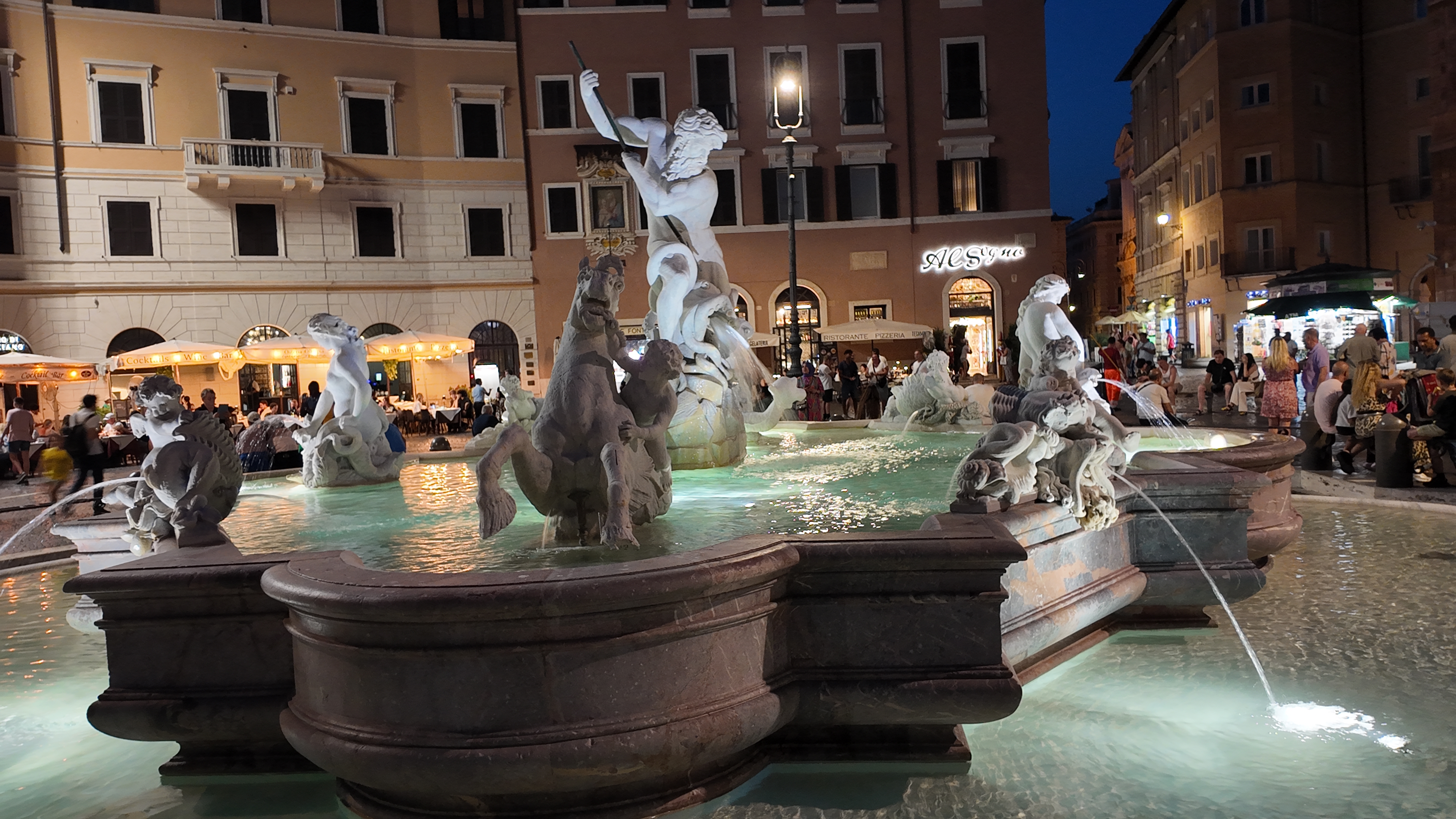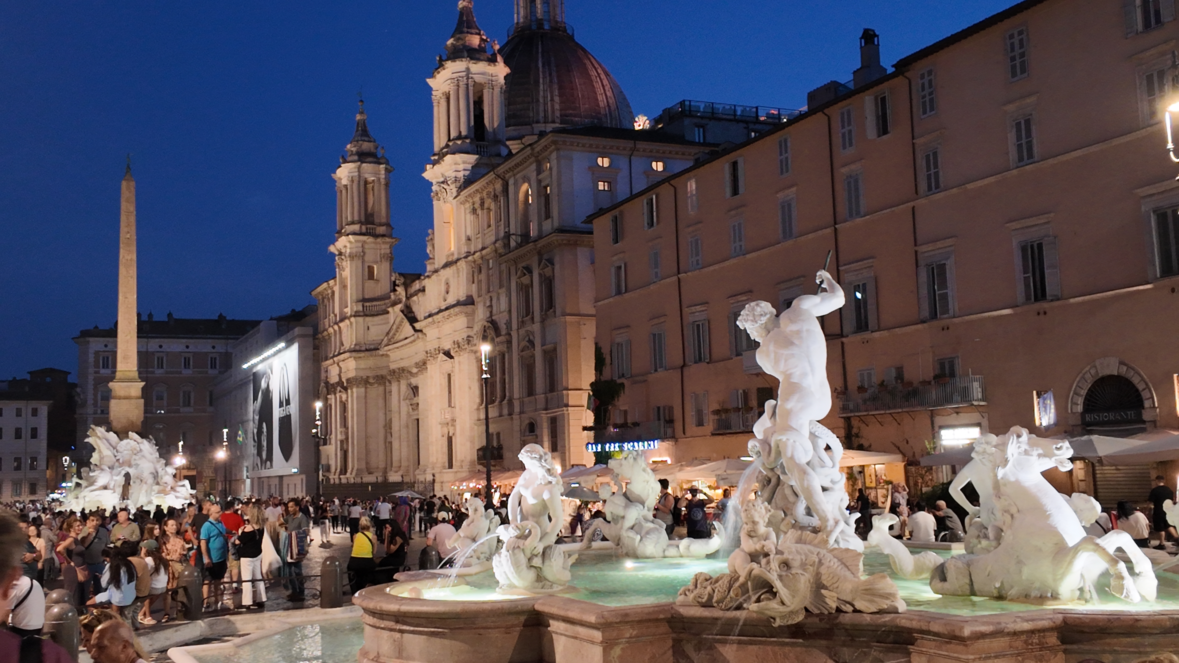 But first we start with “O Solo Mio” (or “It’s Now or Never”, if you’re an Elvis fan) on the hammered dulcimer, before wandering to the Fountain of the Four Rivers in front of the Church of Saint Agnes in Agony.