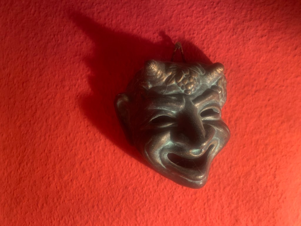 I am sharing pictures of small tragedy and comedy masks that have been hanging on the red wall of the guest bathroom on the ground floor of my family home in Berlin for as long as I can remember. I’ve always enjoyed them but, after a long adulthood of taking them for granted, today I was taken with them anew, enjoying their expressions and how they looked in the light on the red wall; so I decided to take some beauty shots of them.