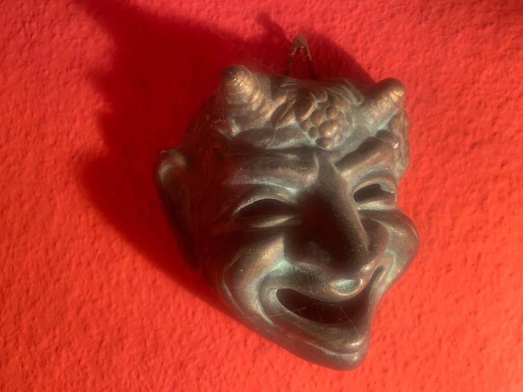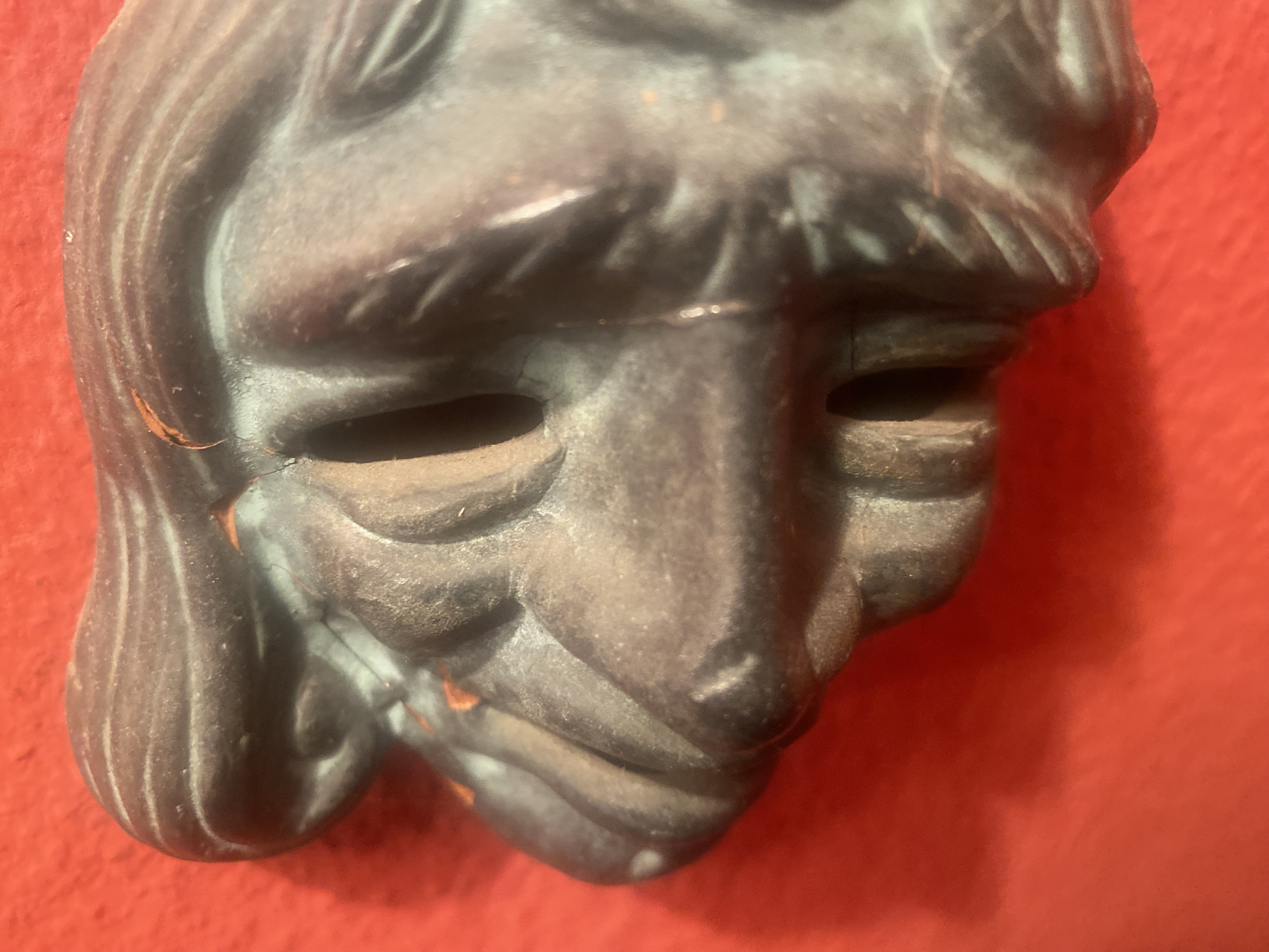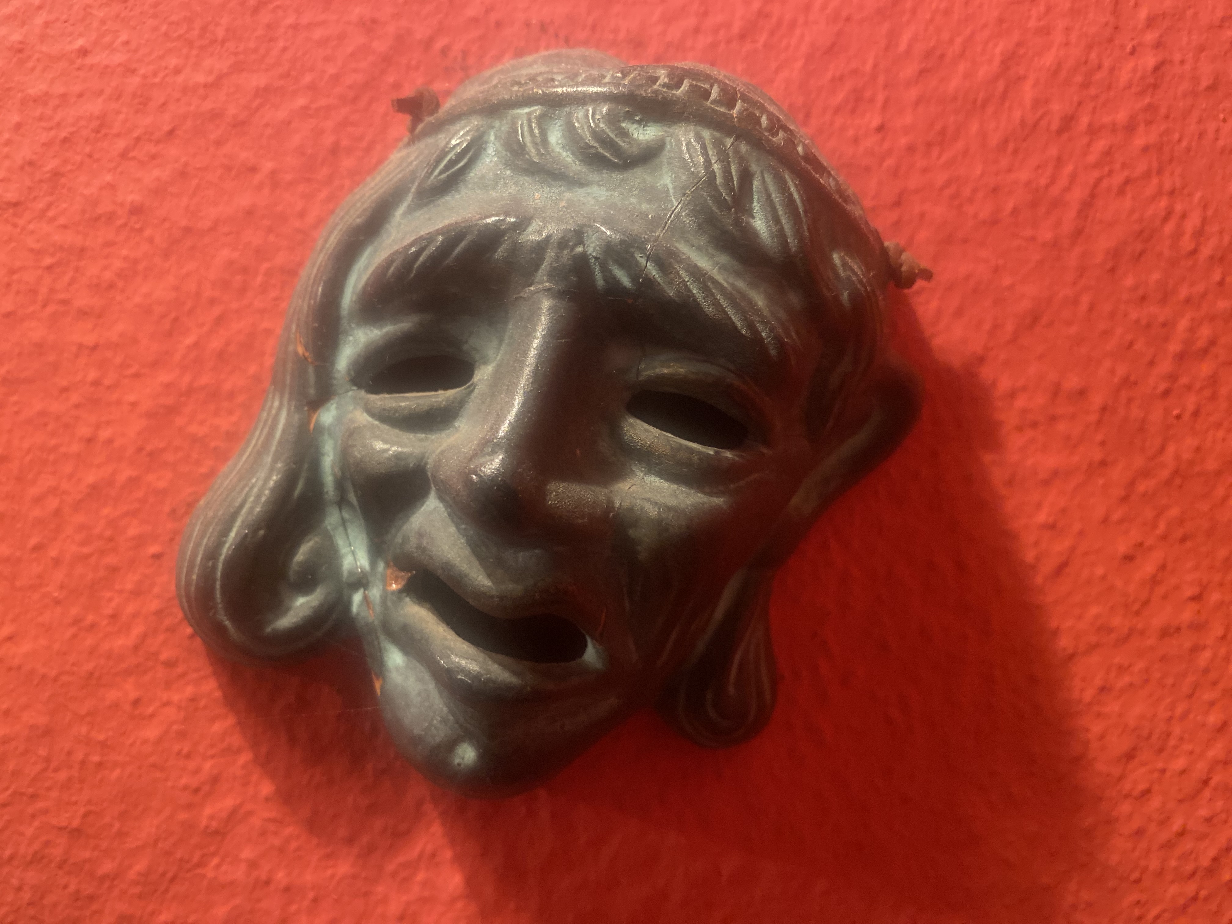 My parents acquired the masks in a souvenir shop in Delphi, Greece, before I was born. They have been with us since the 1960s. One of them particularly looks a little worse for wear. I suspect rough play via my brother or myself. My mother suspects a certain cleaning lady she once employed who “cleaned too aggressively and was always breaking things and then not telling me about it”.