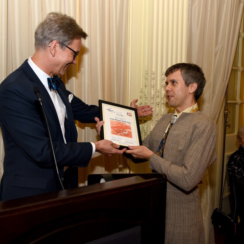 Michael Lahr von Leitis presenting Cole Escola with the Piscator Award