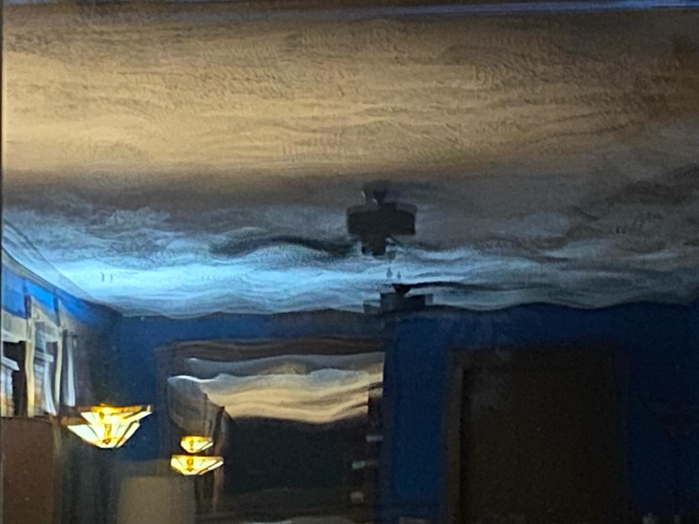 I saw the room reflected in a window at night, and something about the light play made the mirroring wavey and doubled. It looked like a near abstract oil painting to me.