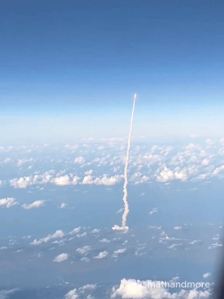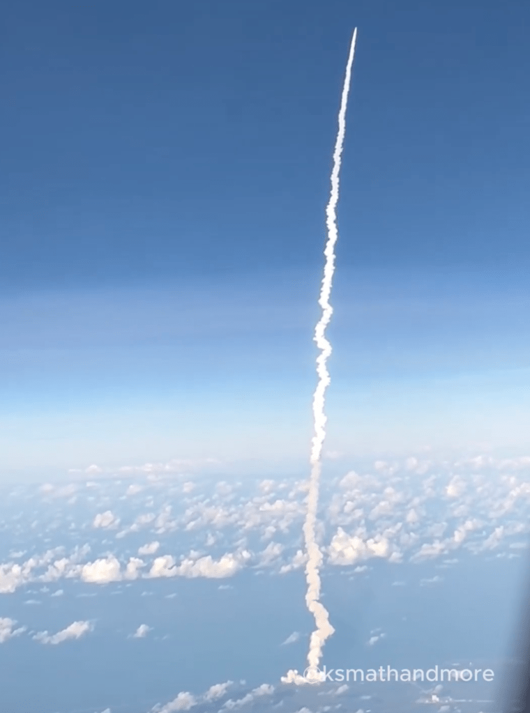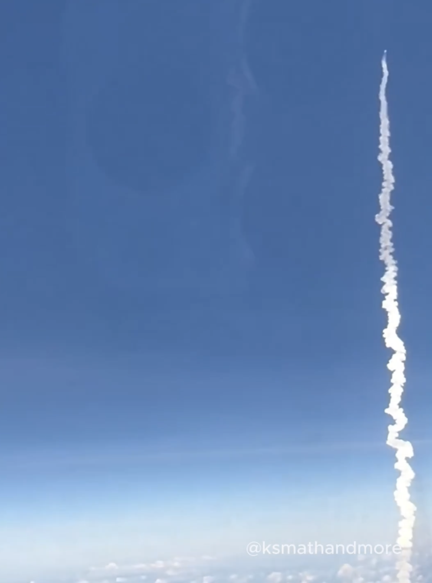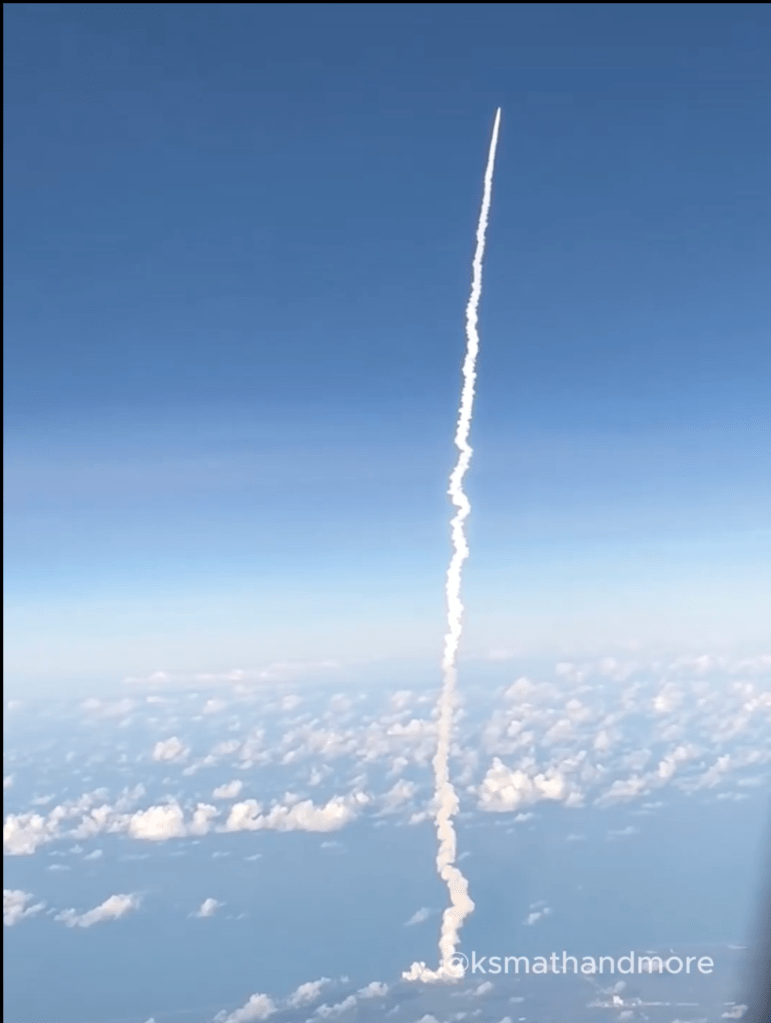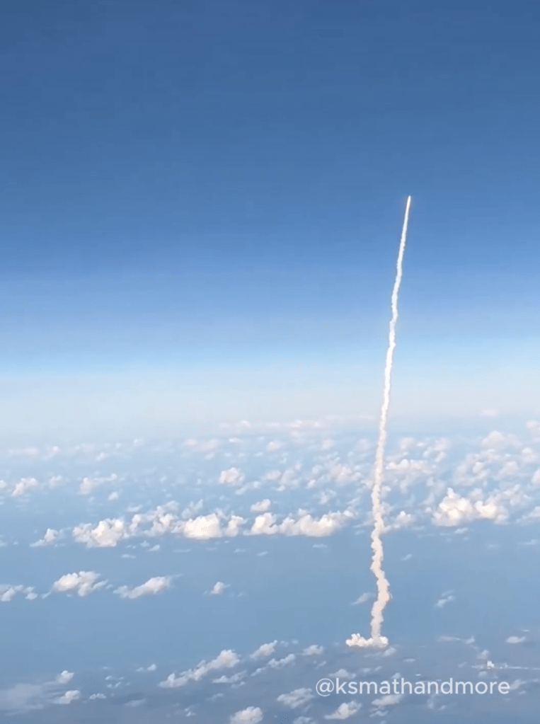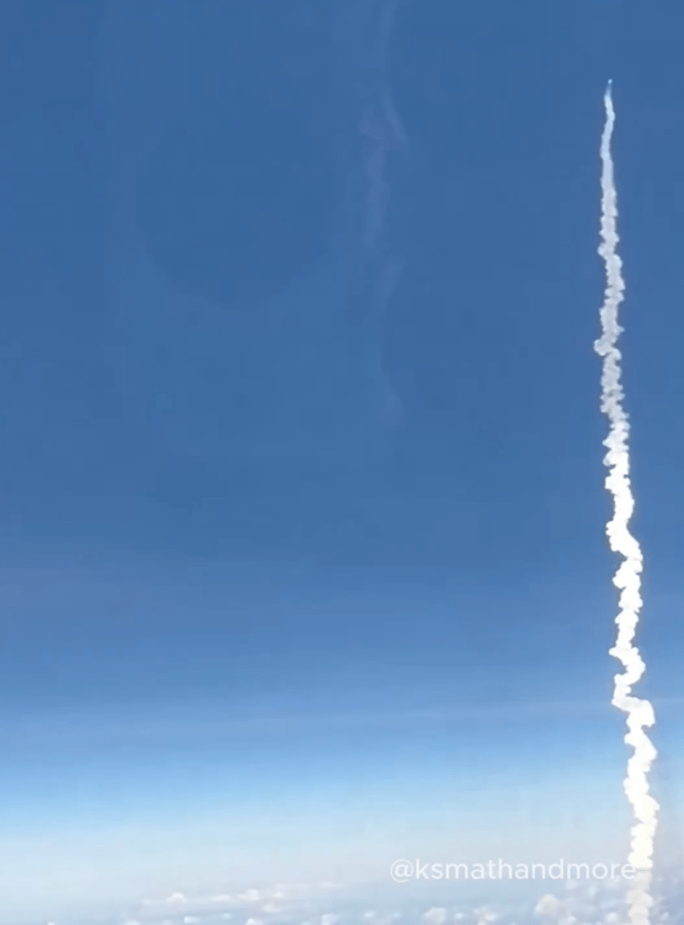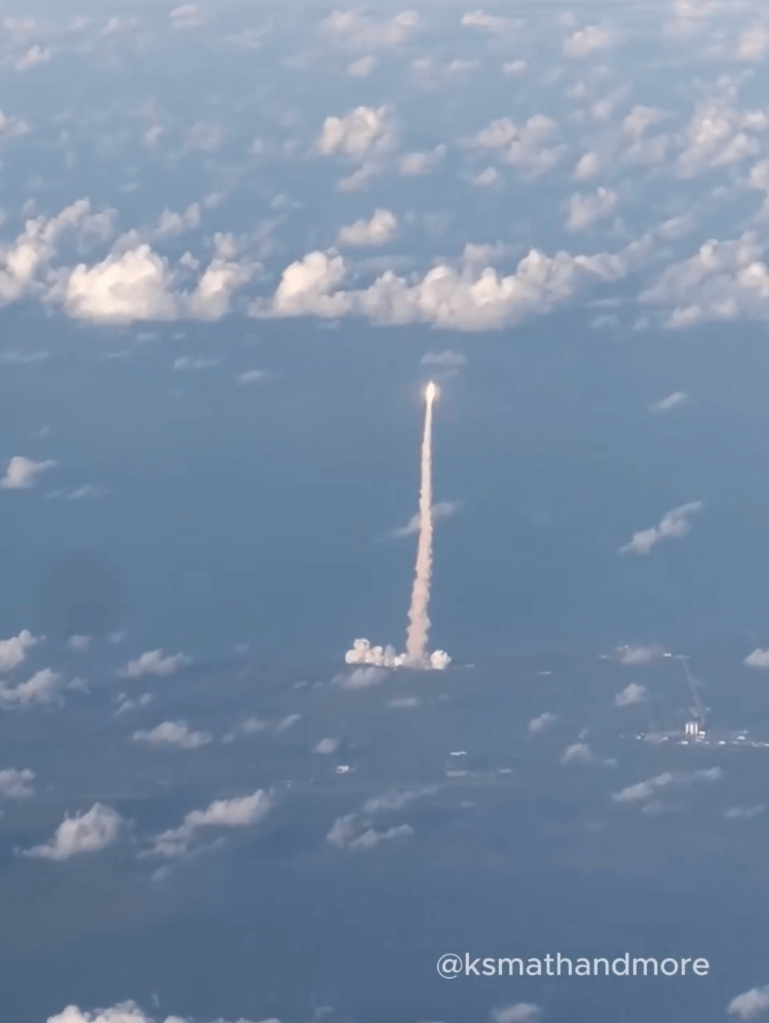 So I took some screenshots which I will share. But if you have access to the site formally known as Twitter, do watch this video. It’s the longest, most comprehensive one I’ve seen of the launch viewed from a plan. Plus the commentary from an elated flight attendant as well as a jaded passenger (who will watch it later on video), not to mention a crying baby, are an amusing accompaniment to the awe inspiring sight.