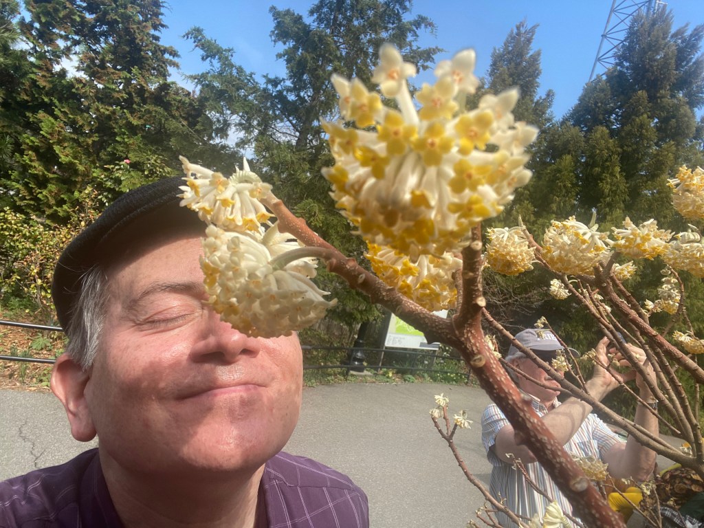 Ed and I enjoyed a sunny day in the Brooklyn Botanic Garden this weekend (that’s me above indulging in the sweet honey scent of the paper bush) and I took some pictures of the first blossoms of Spring.