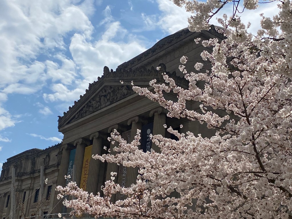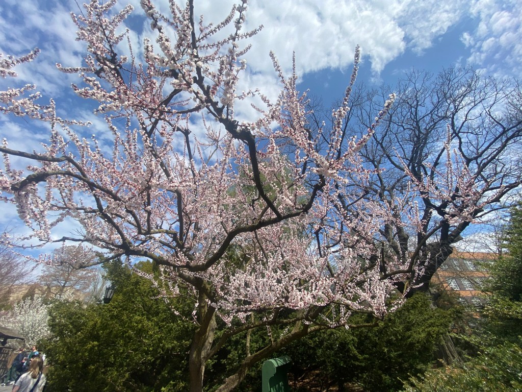 The entrance into the BBG is right next to the Brooklyn Museum where the white blossoms of the Yoshino Cherry trees are already in bloom.