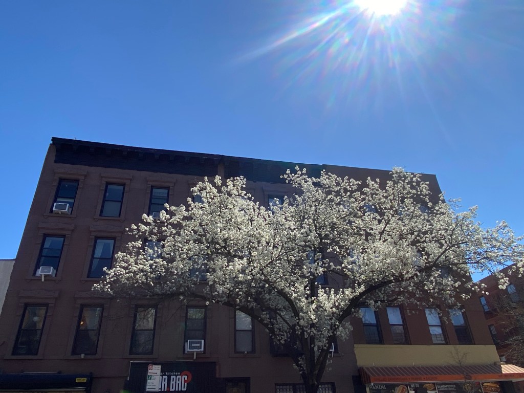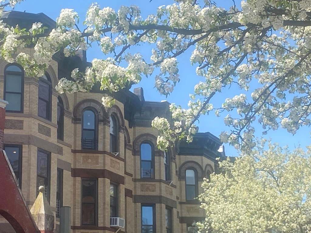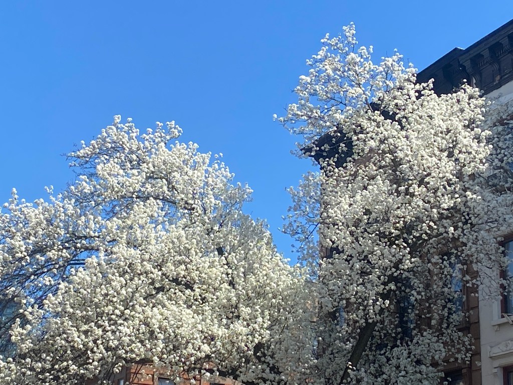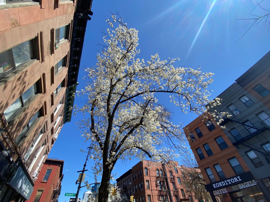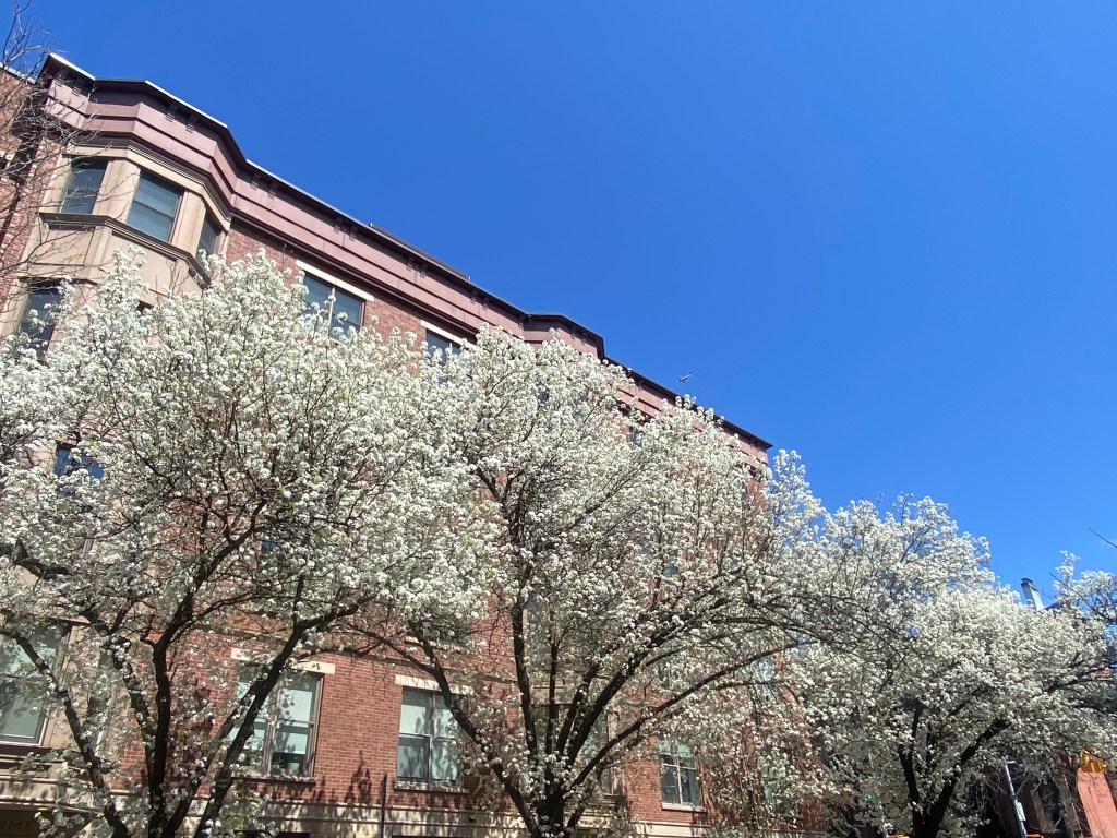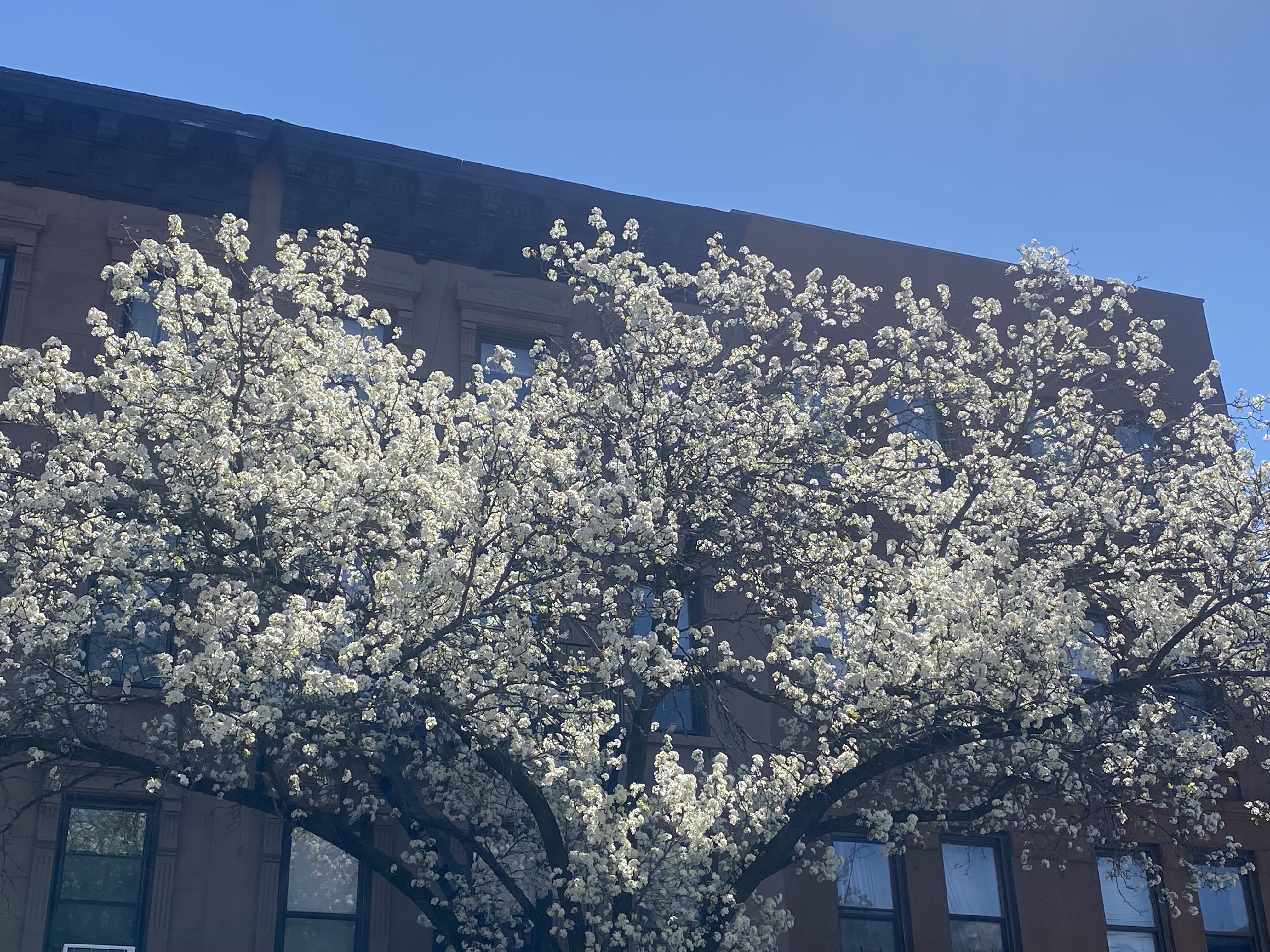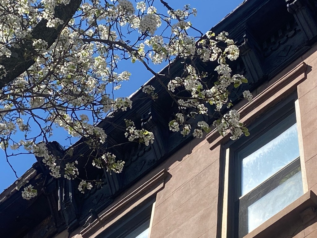 The ornamental pear trees are in full bloom in Park Slope.
