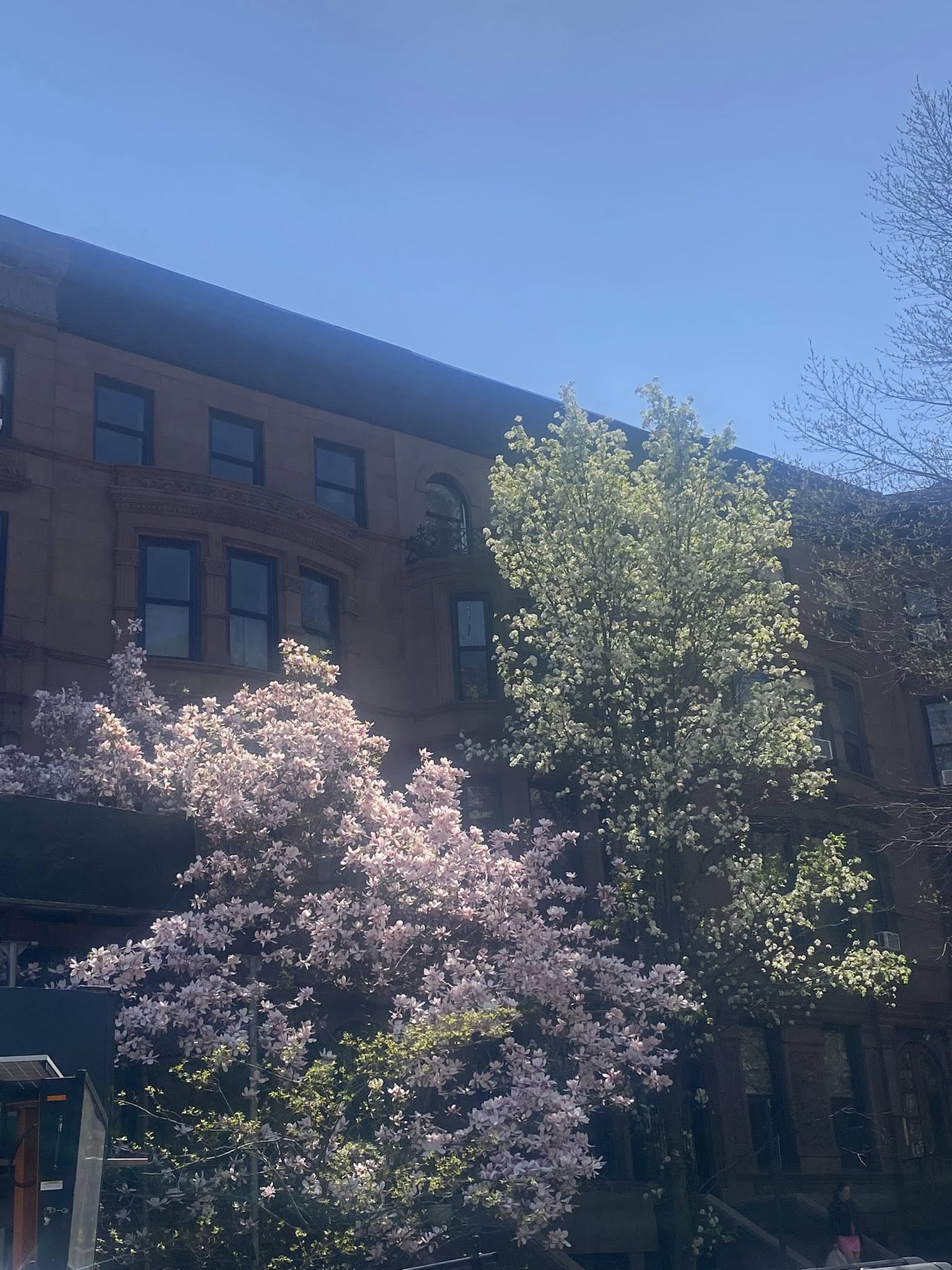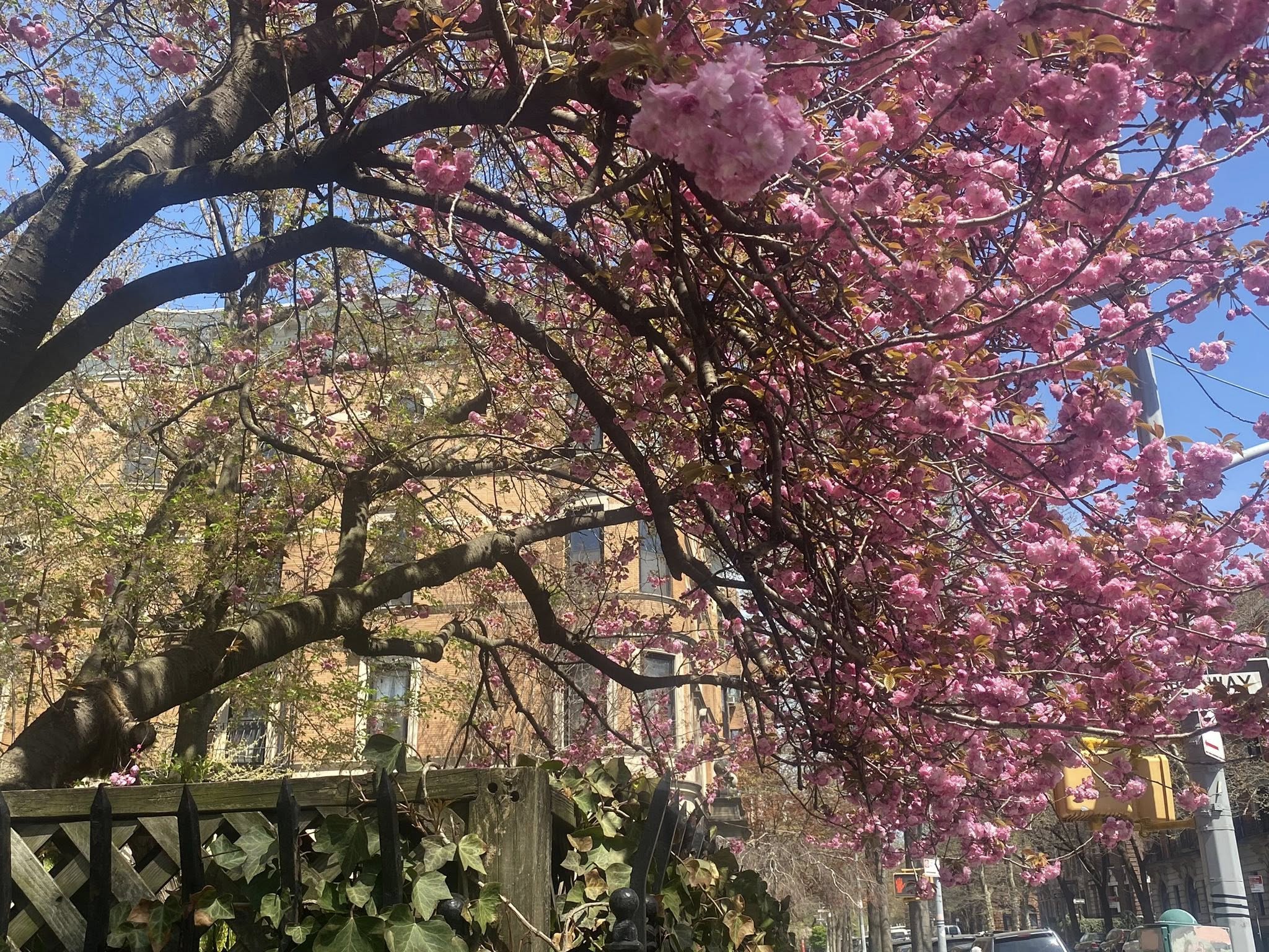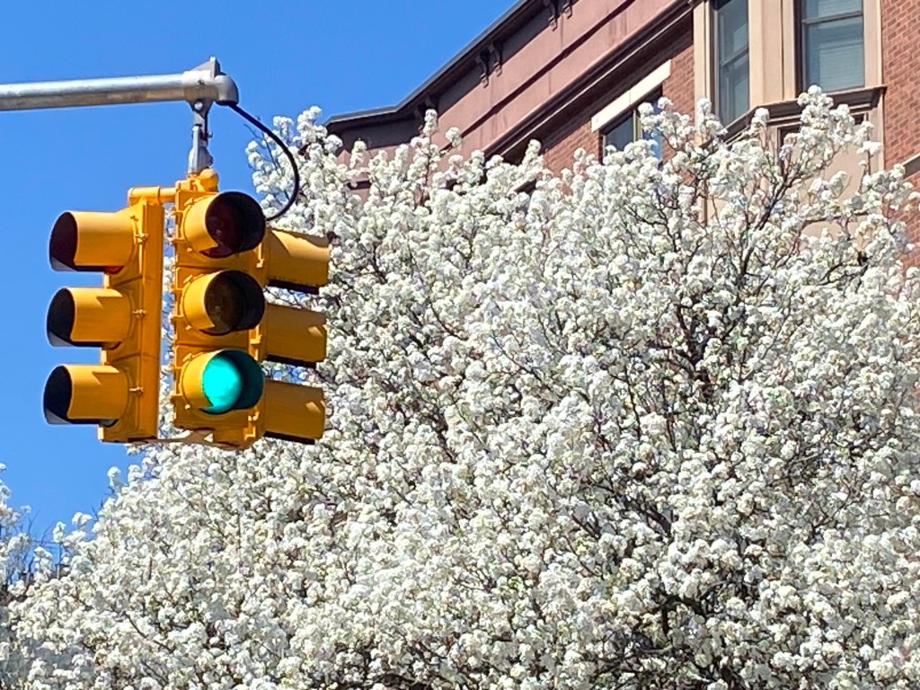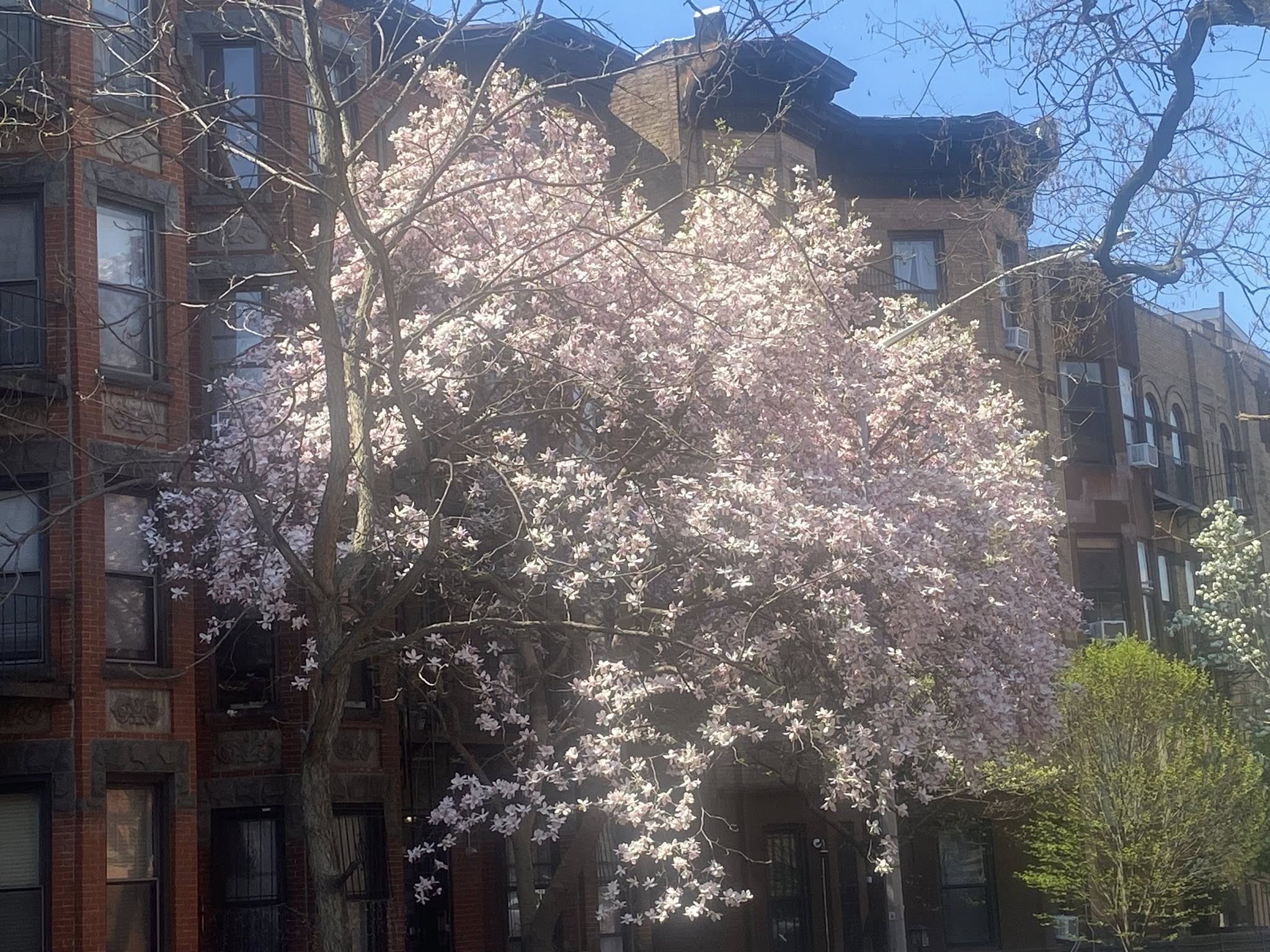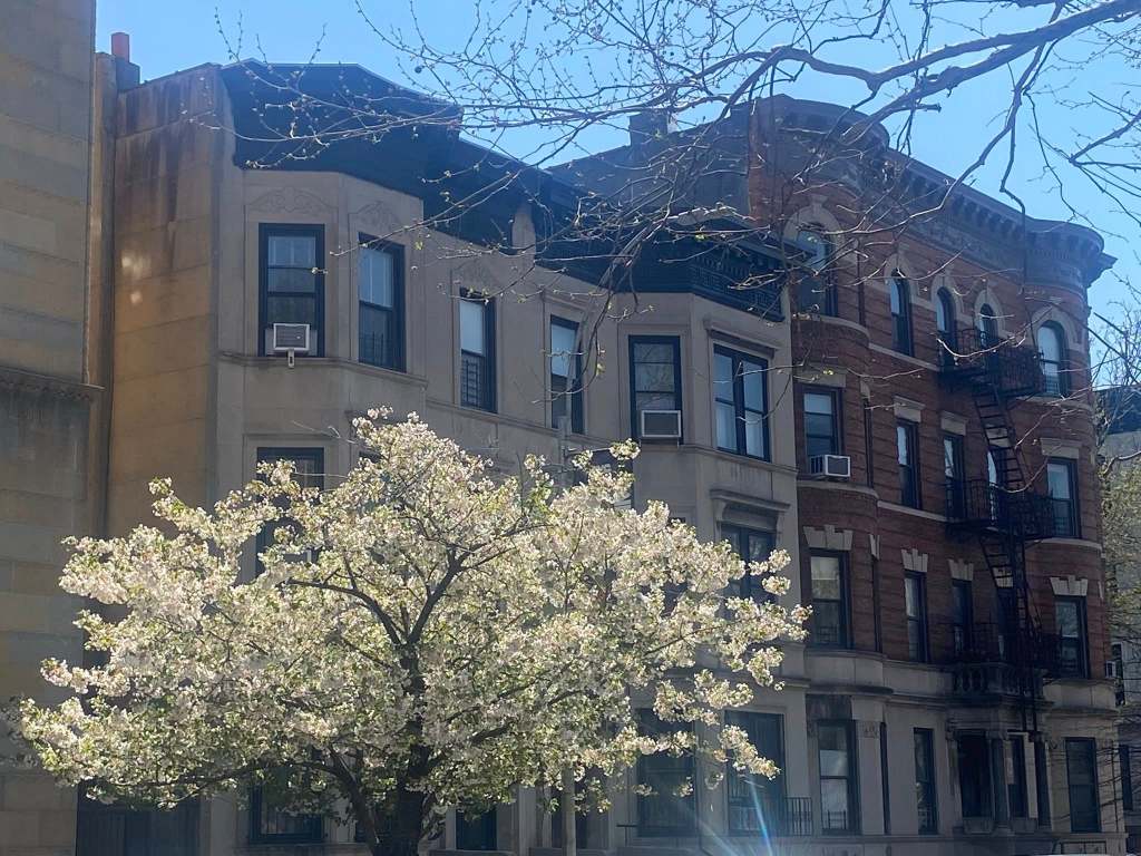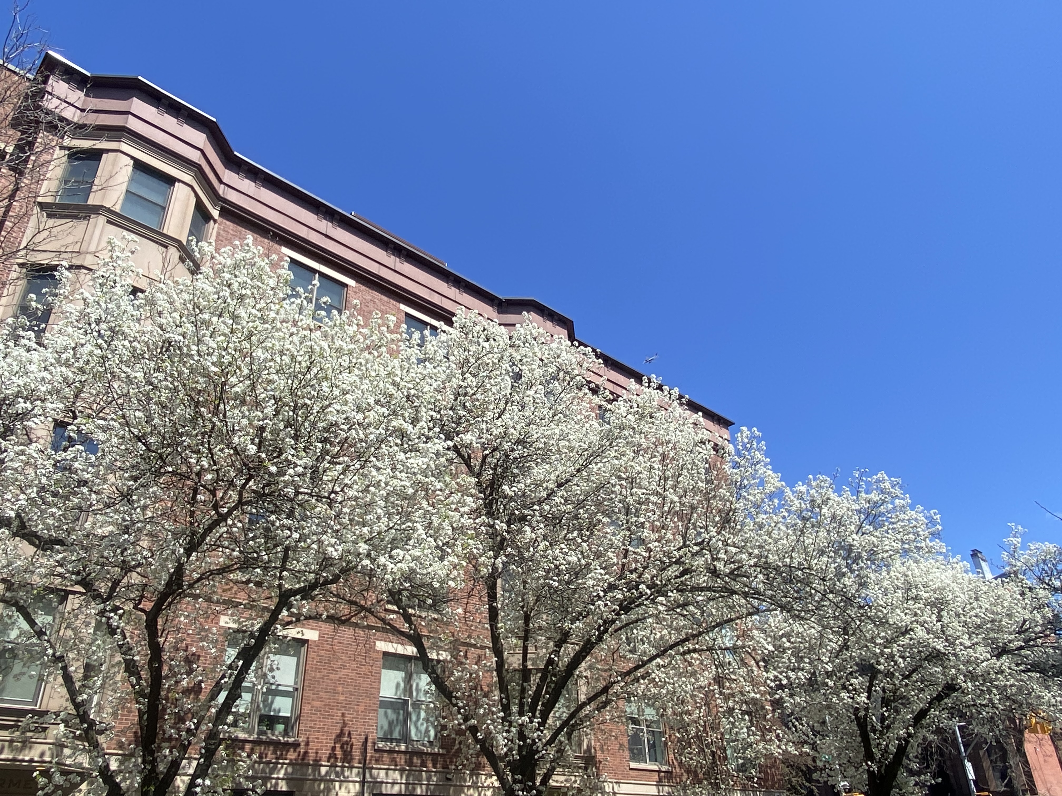 The ornamental pear trees are in full bloom in Park Slope.