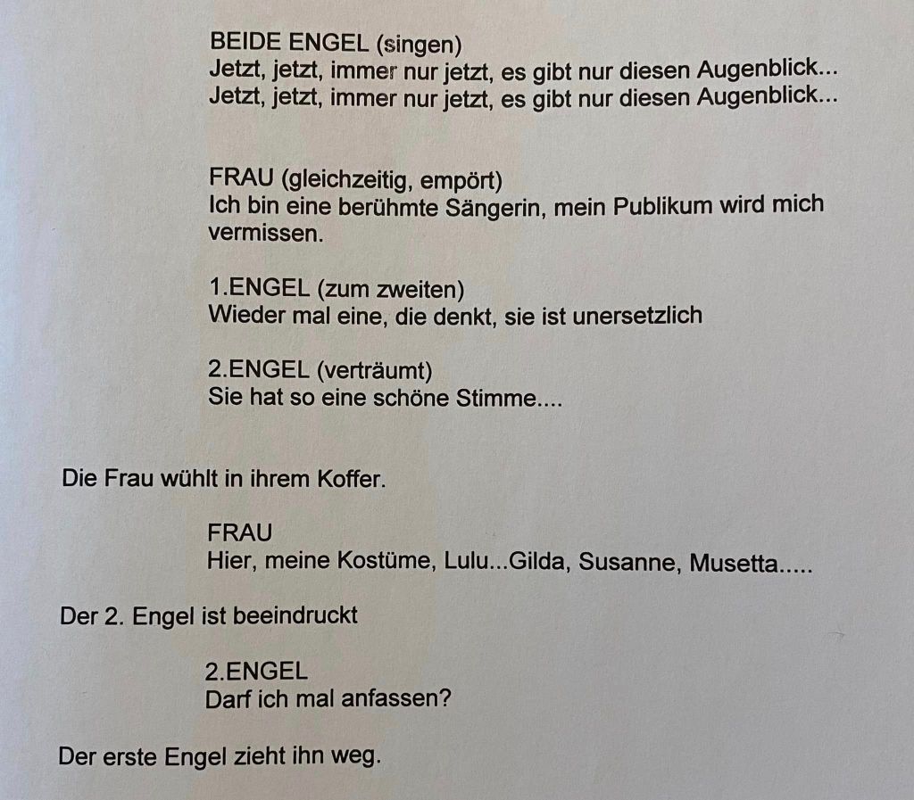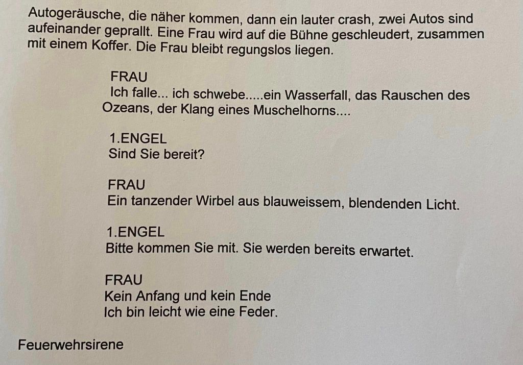 Car sounds that come nearer. Then a loud crash, two cars have smashed into another. A woman is thrown onto the stage, together with a suitcase.