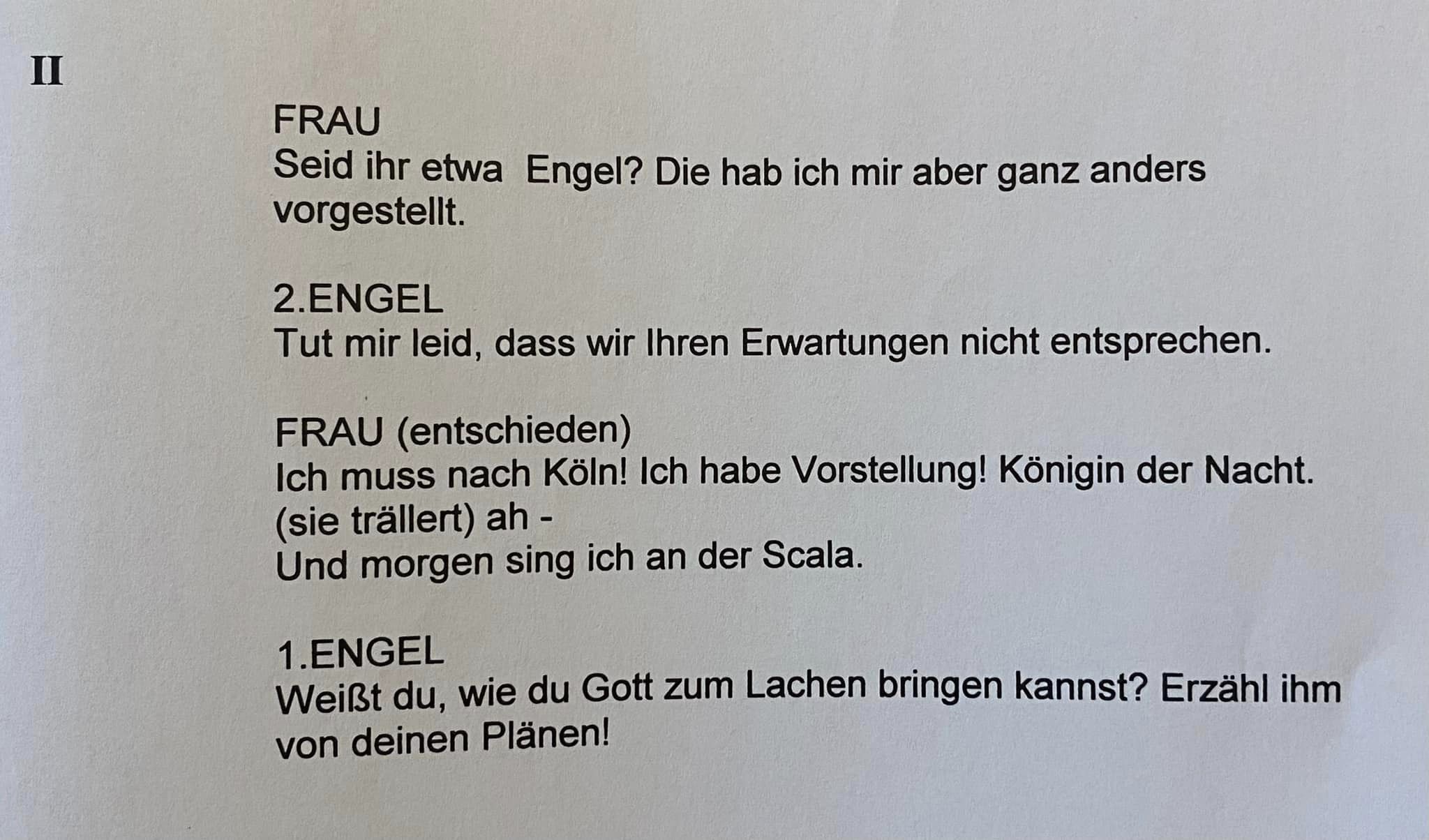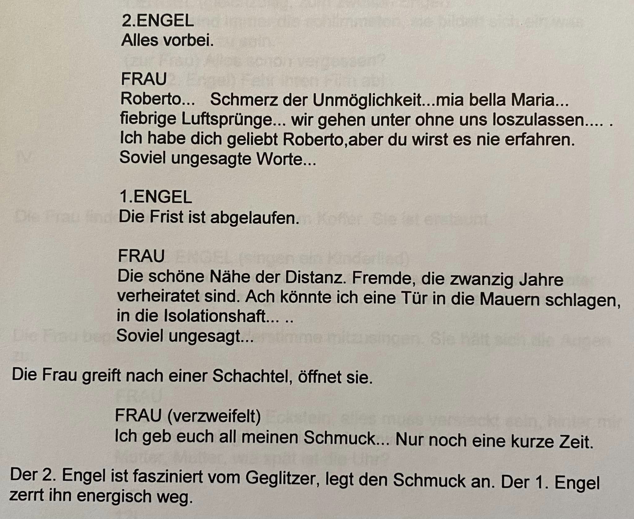 Car sounds that come nearer. Then a loud crash, two cars have smashed into another. A woman is thrown onto the stage, together with a suitcase.