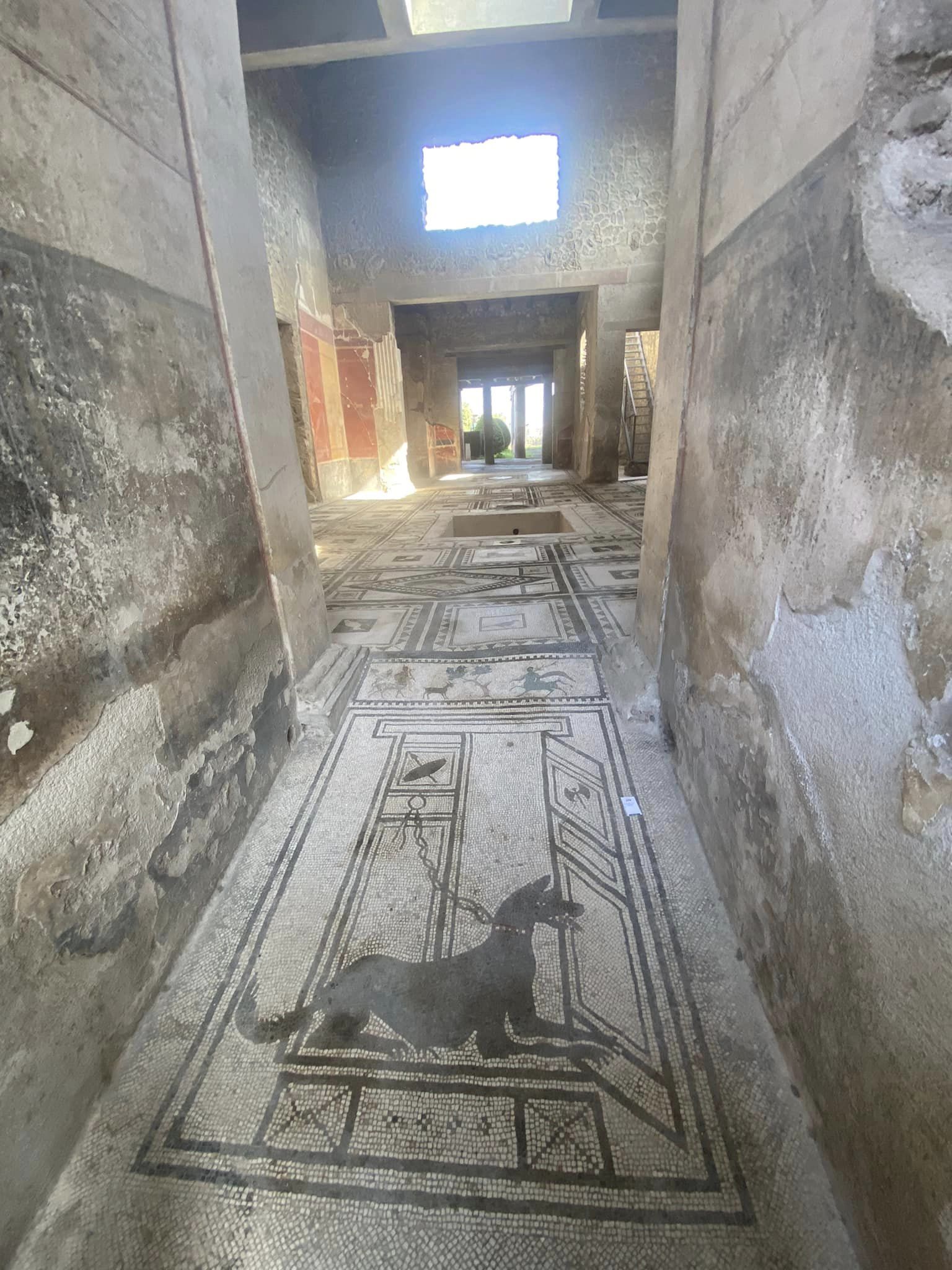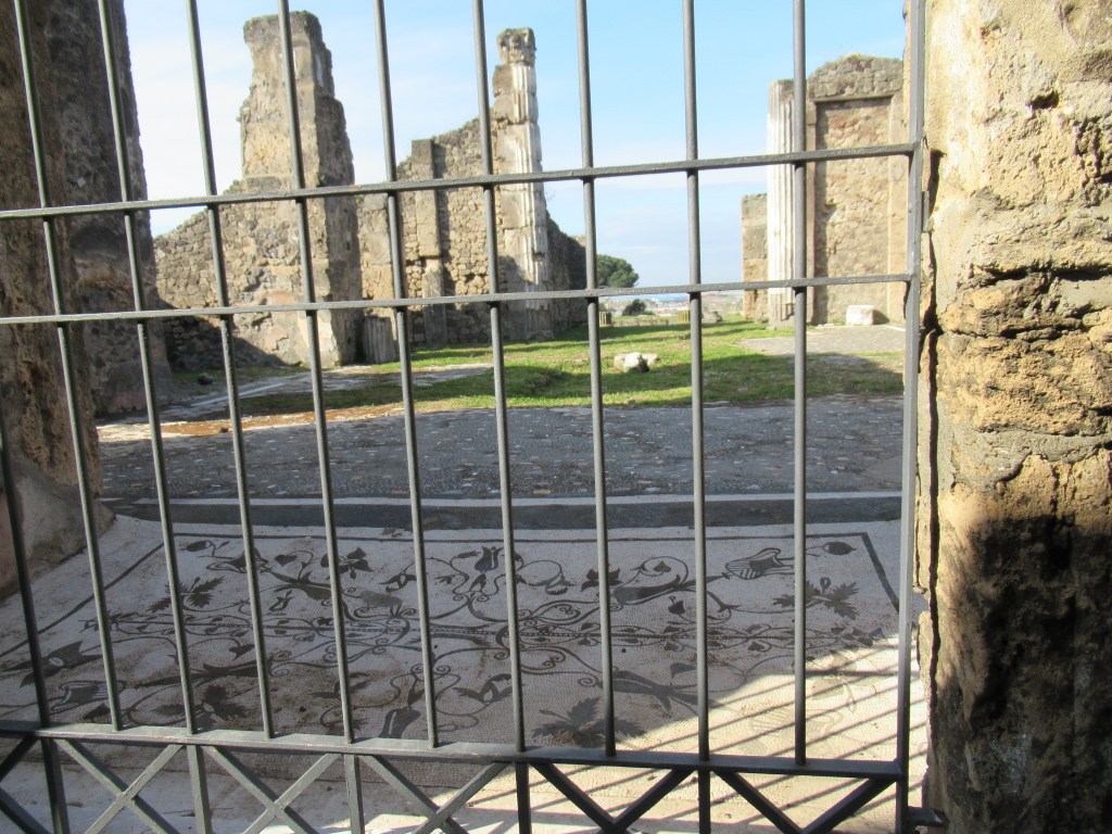 The guard dogs (and museum barriers) kept us from entering these particular homes, but the camera’s zoom does allow for closer inspection of the spectacular floors of this home with the more alert and chained mosaic guard dog.