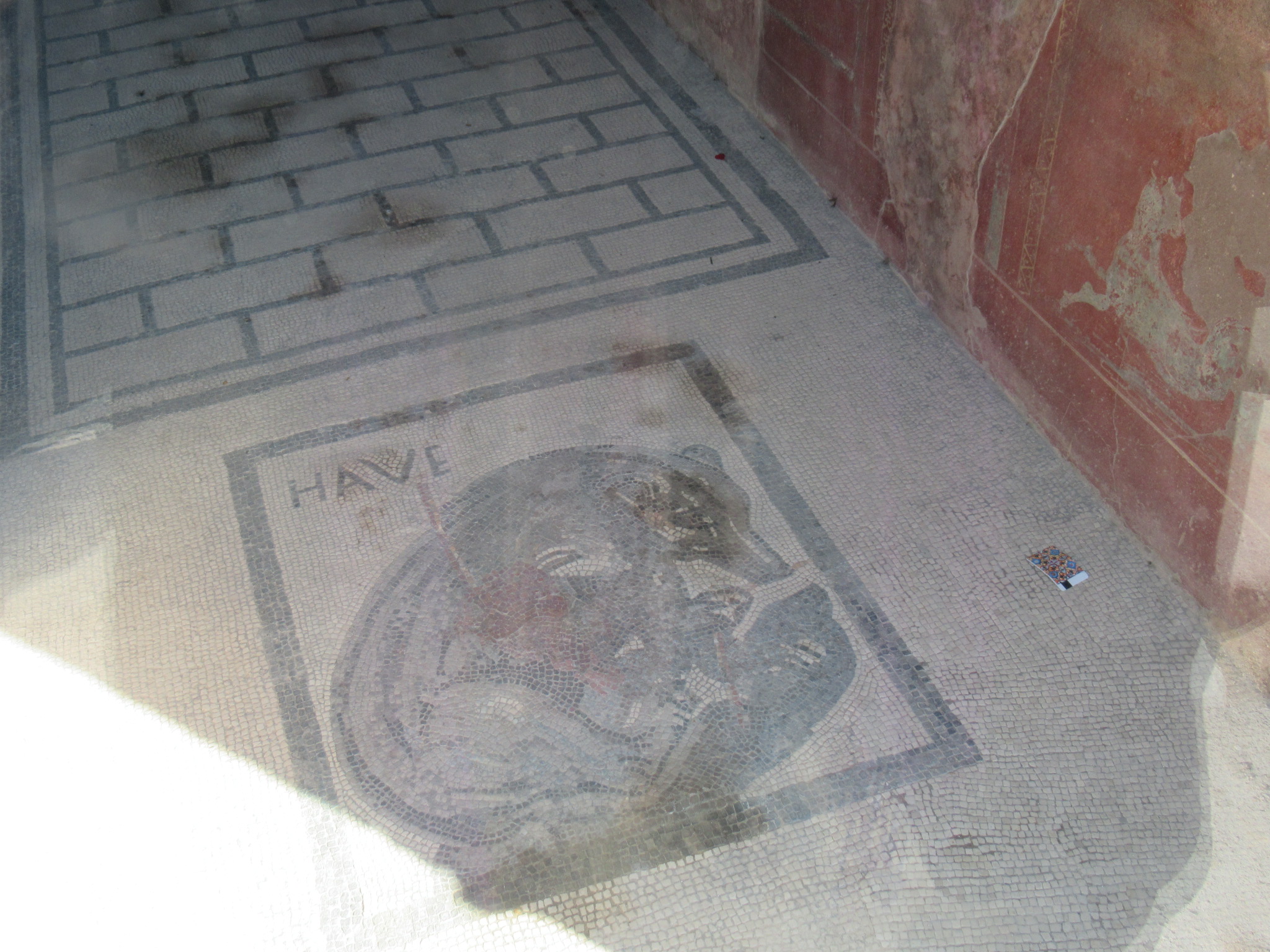 Many front entrance mosaics feature guard dogs. “Have” is the Oscan version of “ave”, meaning hello/goodbye.