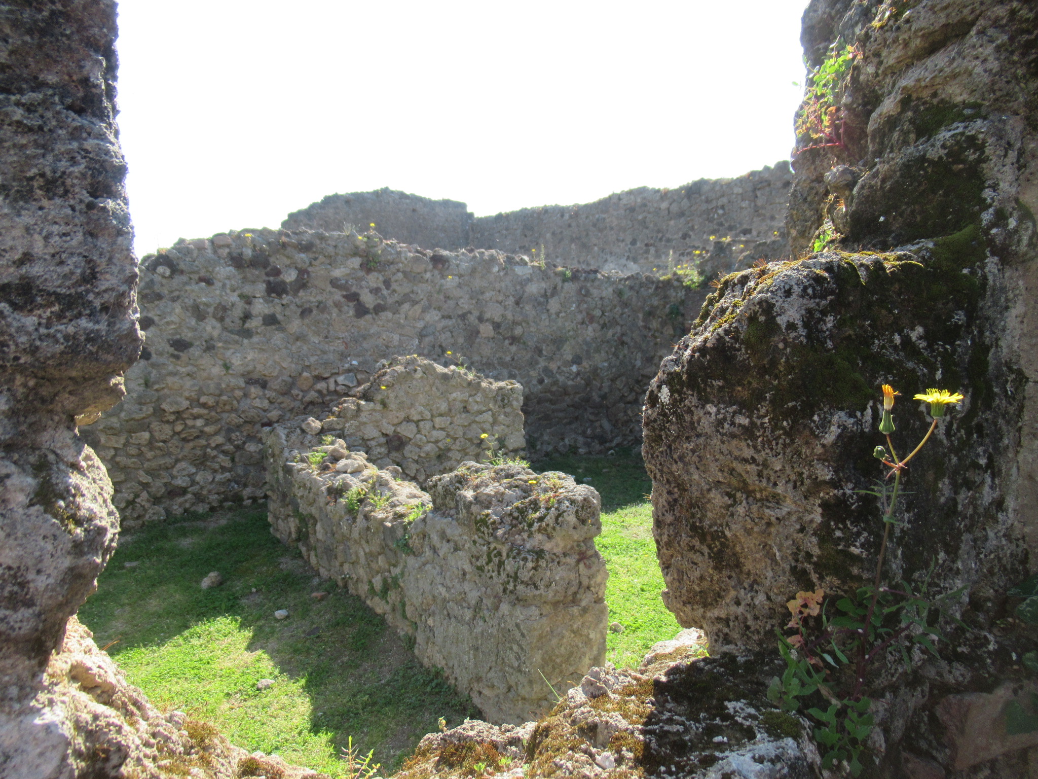 Below, you can see the deep grooves centuries of chariot wheels made in the stone roads, specifically where they maneuvered between the stepping stones. The stepping stones were there for ancient Roman pedestrians to safely step across the roads during their daily wash – apparently the roads were flooded with water daily to get rid of dirt (all those chariots, all those horses, all that … muck…). Romans wore sandals, not galoshes…