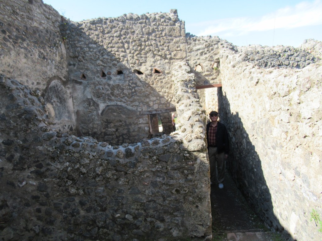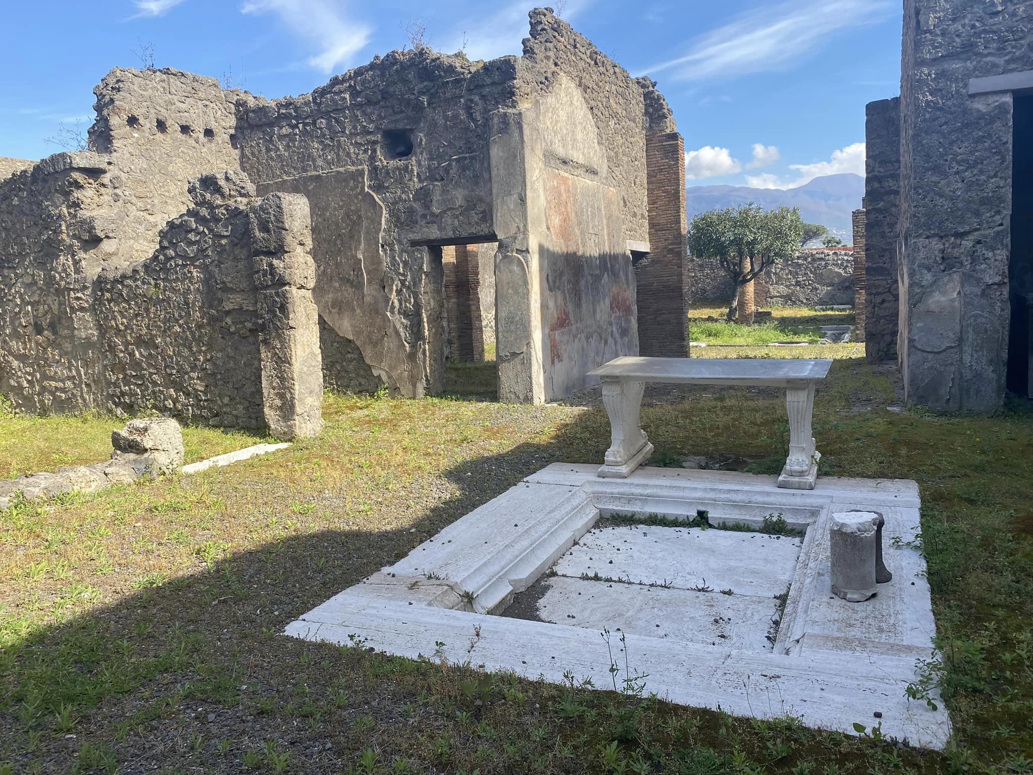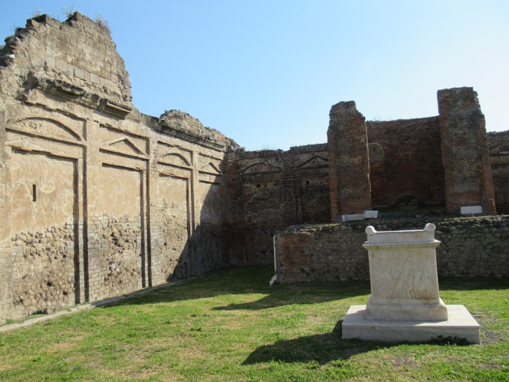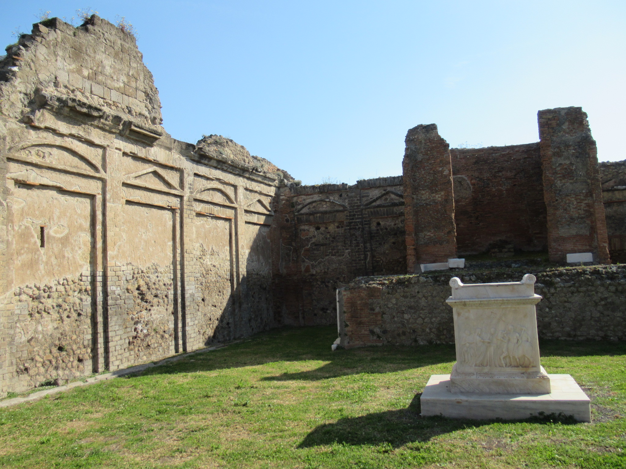 Jupiter’s Temple. One of the few structures where any part of an upper story is still standing. When Vesuvius first erupted the prevailing winds sent so much ash towards Pompeii over the course of a day that the roofs collapsed. That is why very little above the first floor is recoverable in Pompeii – unlike in Herculaneum which was spared that first day-long ash cloud but not the pyroclastic flow, a fast-moving current of hot gas and matter, that followed it. That deadly explosion swiftly killed whoever was still in both cities. It was quickly followed by massive amounts of ash that completely covered – and preserved – what was left of Pompeii and Herculaneum.